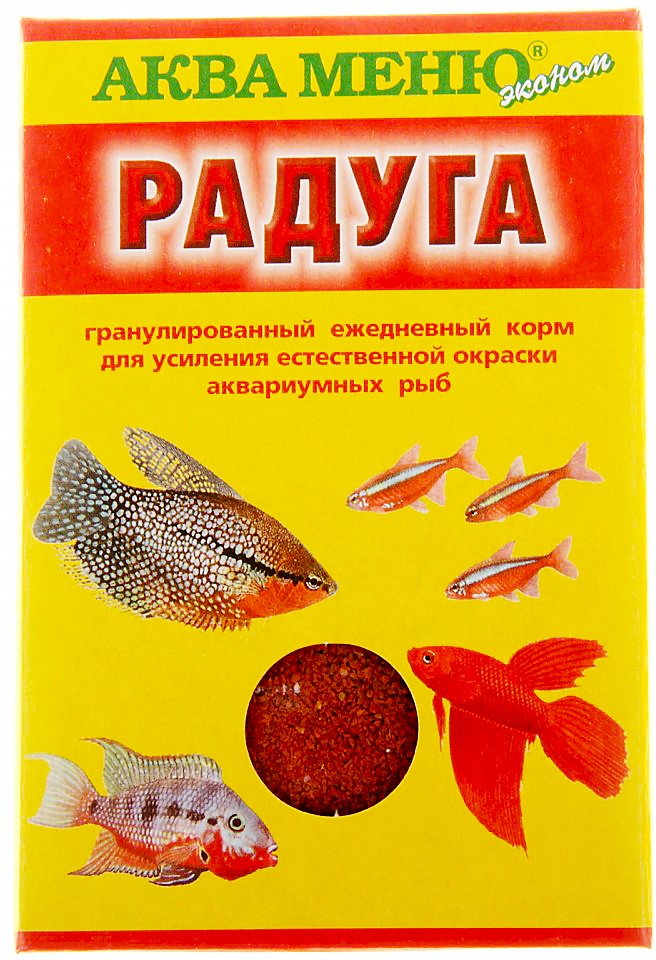 «РАДУГА» — экструдированный ежедневный корм для усиления естественной окраски. Предназначен для большинства видов аквариумных рыб: живородящих, цихлид, харациновых, лабиринтовых, карповых, различных сомов и других рыб длиной 2–10 см. Отличительная особенность этого корма — добавка натурального стимулятора, улучшающего общее состояние рыб и окраску их тела.