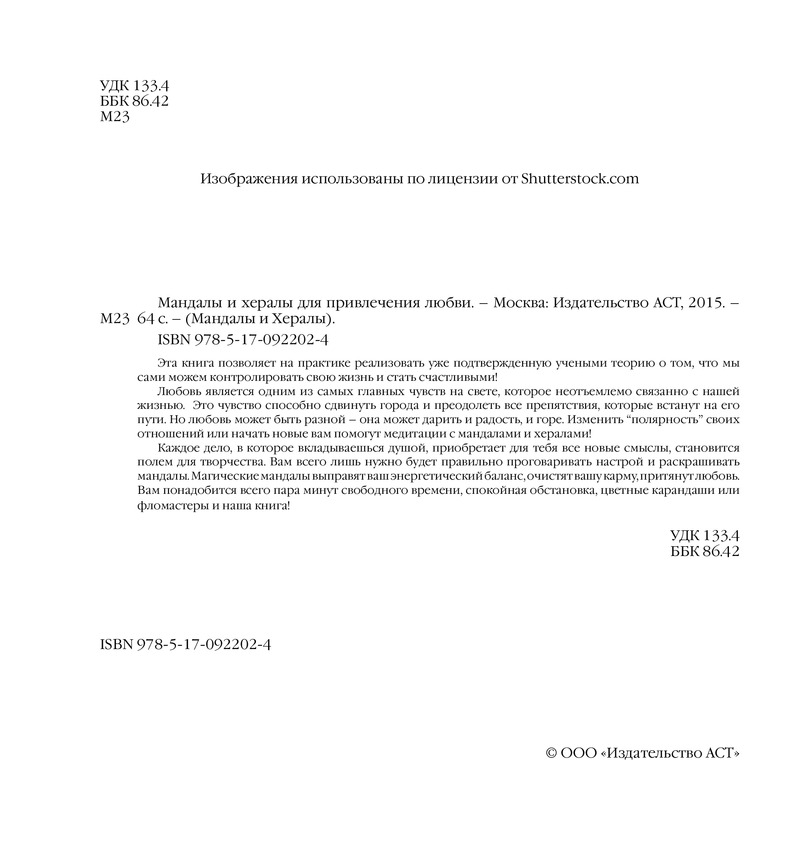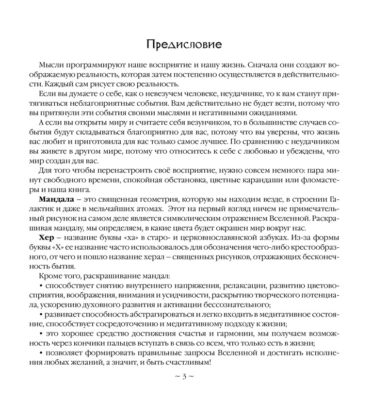 В данный момент этот товар отсутствует в продаже. Возможно, у нас найдется аналогичный или похожий товар здесь. Серия: Мандалы и хералы Эта книга позволяет на практике реализовать уже подтвержденную учеными теорию о том, что мы сами можем контролировать свою жизнь и стать счастливыми!