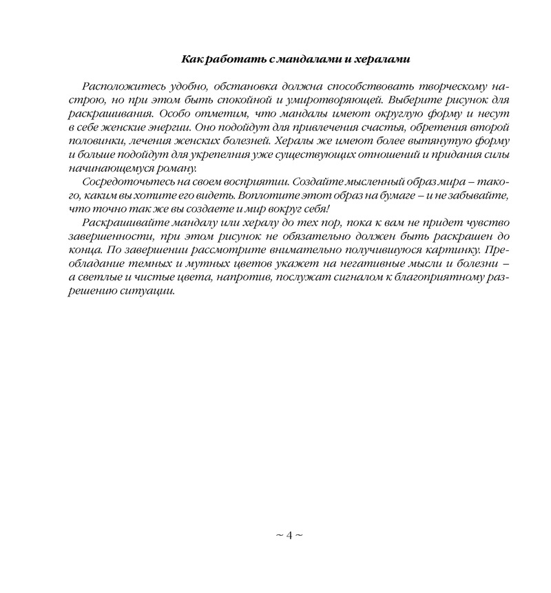 Каждое дело, в которое вкладываешься душой, приобретает для тебя все новые смыслы, становится полем для творчества. Вам всего лишь нужно будет правильно проговаривать настрой и раскрашивать мандалы. Магические мандалы выправят ваш энергетический баланс, очистят вашу карму, притянут любовь. Вам понадобится всего пара минут свободного времени, спокойная обстановка, цветные карандаши или фломастеры и наша книга! |