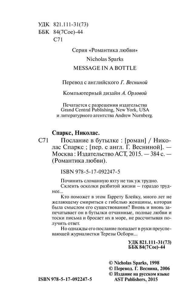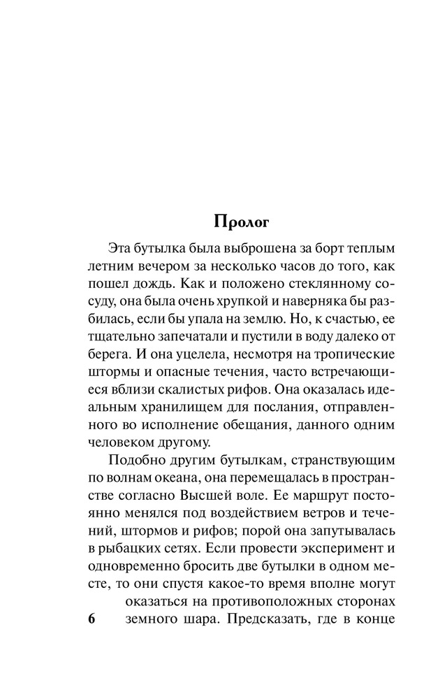 Удивительно трогательная книга о настоящей любви. Найдя на берегу бутылку с письмом внутри, журналистка Тереза поражена содержанием письма мужчины для своей погибшей любимой Кэтрин. Далее обнаруживаются ещё письма в бутылка. Тереза разыскала автора - Гаррита Блейка. Возникшая между ними любовь заканчивается трагедией. Обстоятельства часто бывают очень сильны...Но память о настоящей любви будет вечна!