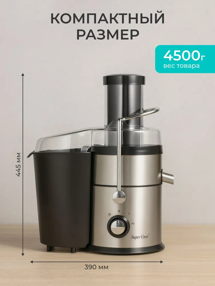 • широкий желоб 6,5 см и контейнер для сока 1,5 л: загрузочный желоб позволяет закладывать крупные дольки фруктов и овощей, снижая объём предварительной нарезки, а контейнер рассчитан на порцию напитка для нескольких человек без частой остановки работы прибора;