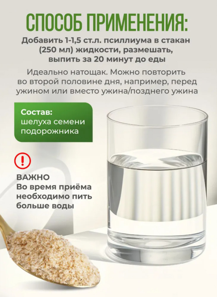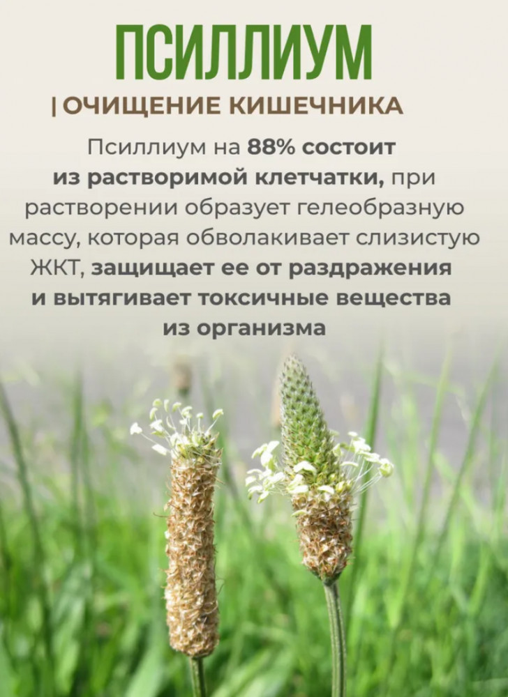 Псиллиум — натуральный источник клетчатки для здоровья и стройности! Псиллиум (шелуха семян подорожника индийского) — суперфуд, который заботится о вашем организме изнутри. При добавлении в жидкость (воду, кефир, йогурт, сок или смузи) он мгновенно превращается в мягкий, приятный на вкус гель, насыщая клетчаткой и мягко очищая организм.