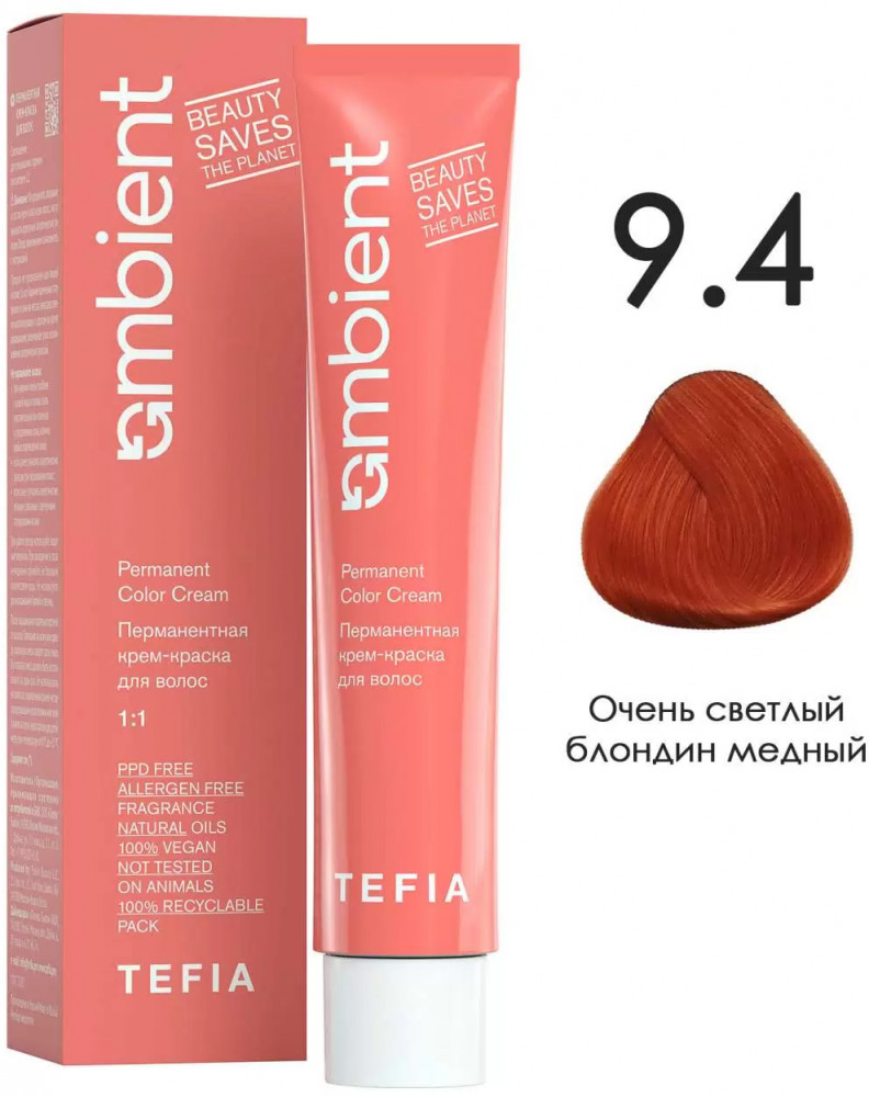 Tefia Крем-краска для волос перманентная, оттенок 9.4 Очень светлый блондин медный