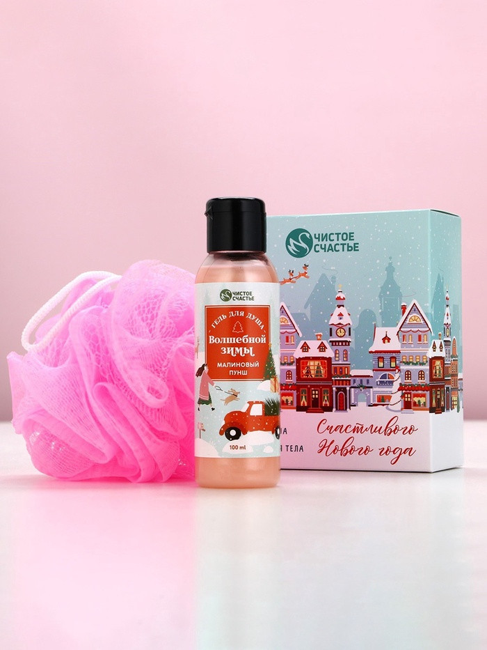 Новогодний подарочный набор косметики «счастливого Нового года» — идеальный выбор для создания праздничного настроения и заботы о себе или близких! В набор входит ароматный гель для душа 100 мл «малиновый пунш», который мягко очищает и увлажняет кожу, а также мочалка для тела, обеспечивающая комфортный и приятный душевой ритуал.