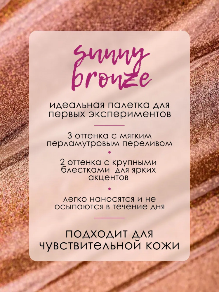Палетка Sunny Bronze — это теплые, солнечные оттенки с лёгким бронзовым переливом. Идеальны для летнего настроения и яркого макияжа. Нежная текстура, безопасный состав и лёгкое нанесение — покорят сердца юных модниц.