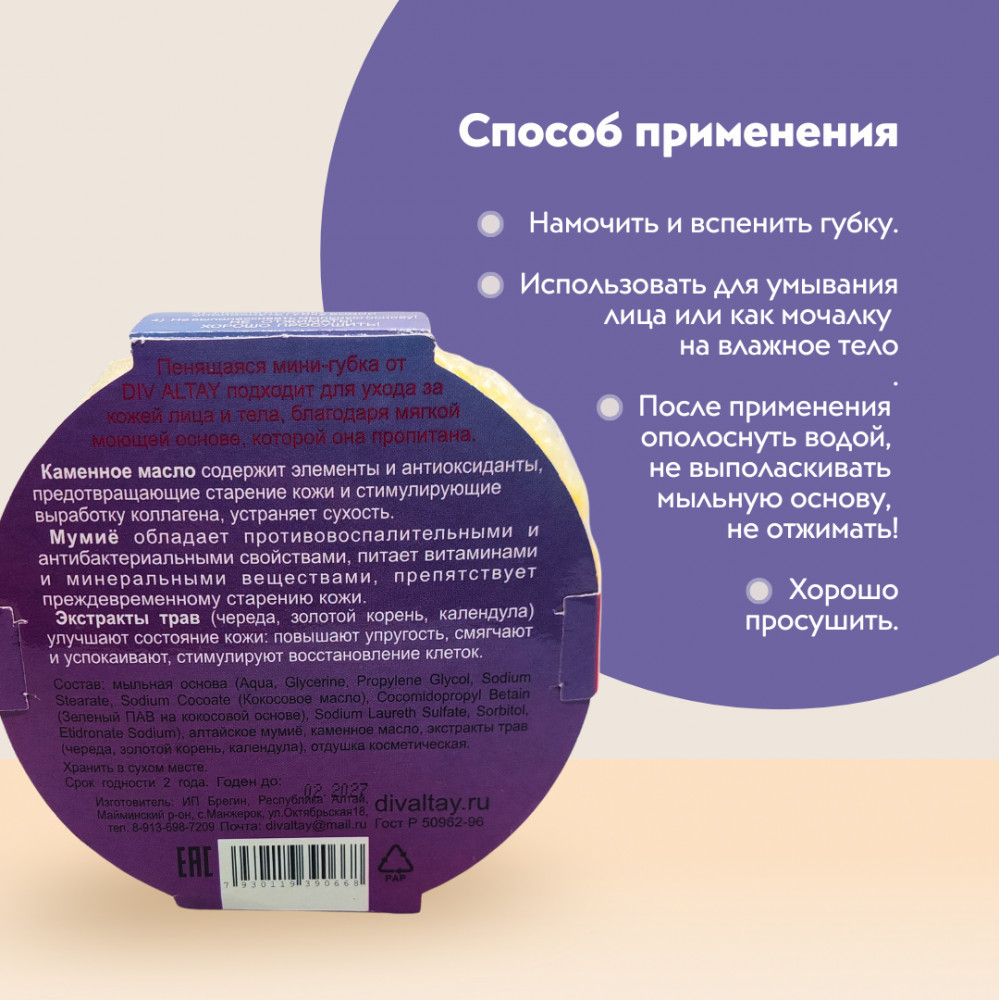 Способ применения: намочить и вспенить губку, использовать для умывания лица или как обычную мочалку на влажное тело. После использования ополоснуть губку водой. Не выполаскивать мыльную основу! Не отжимать! Хорошо просушить!
