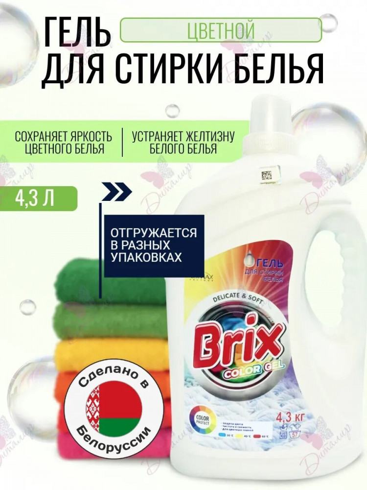 Гель для стирки Brix Color Brix — это высококачественное средство для стирки, разработанное специально для цветных тканей. Произведенный в Беларуси, этот продукт обеспечивает эффективное и бережное удаление загрязнений различной природы при низкой температуре воды. Особенностью геля является его состав, благодаря которому гель не только эффективно удаляет загрязнения, но и защищает цветные ткани от закрашивания, обеспечивая их яркость и насыщенность цвета. Гель Brix Color обладает антибактериальным эффектом, что делает его безопасным для использования даже на деликатных тканях. Аромат свежести, который оставляет после себя гель, делает процесс стирки еще более приятным и комфортным. Упаковка геля выполнена в виде удобной бутылки объемом 4,3 литра, что позволяет использовать его на протяжении длительного времени.