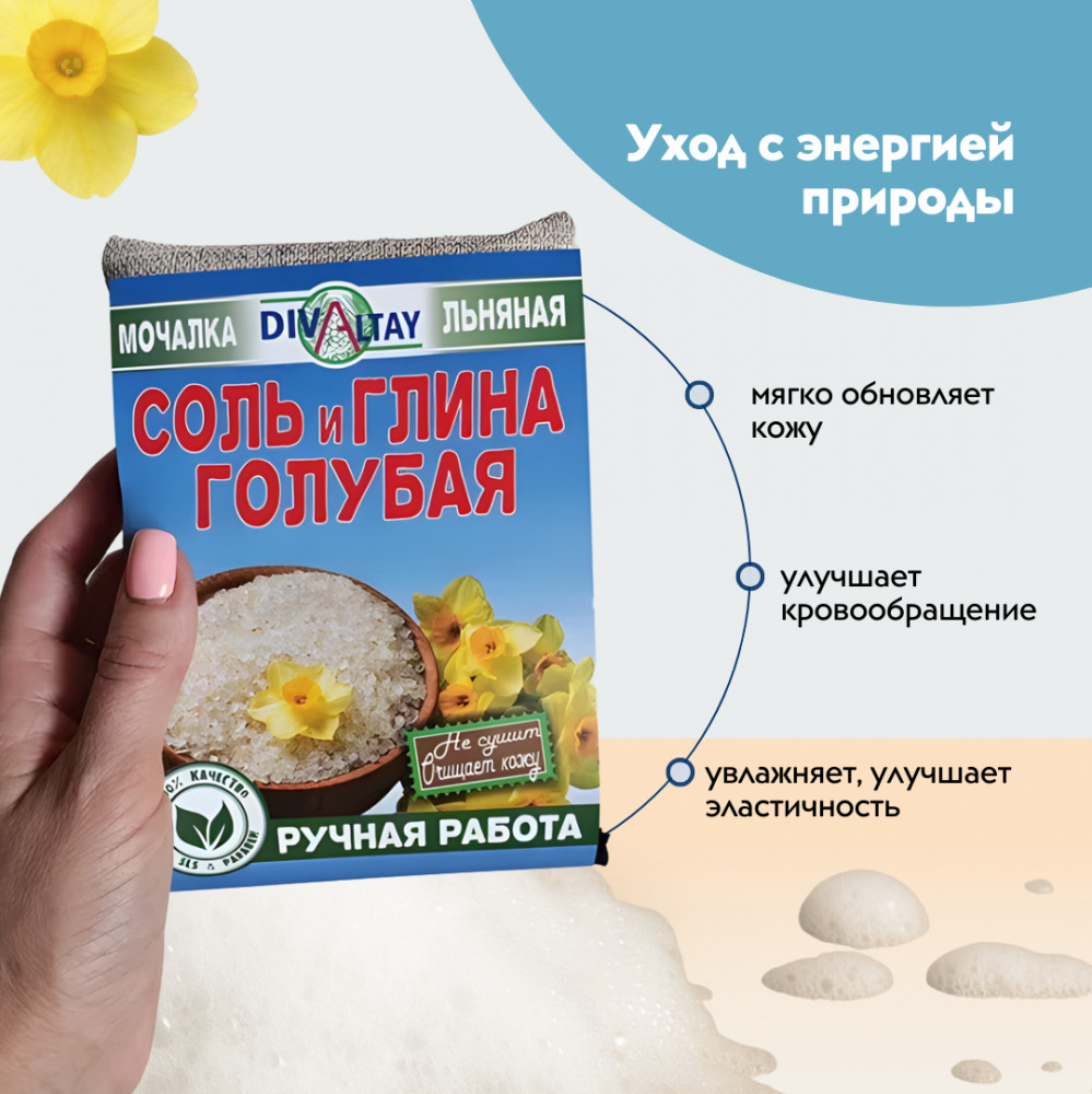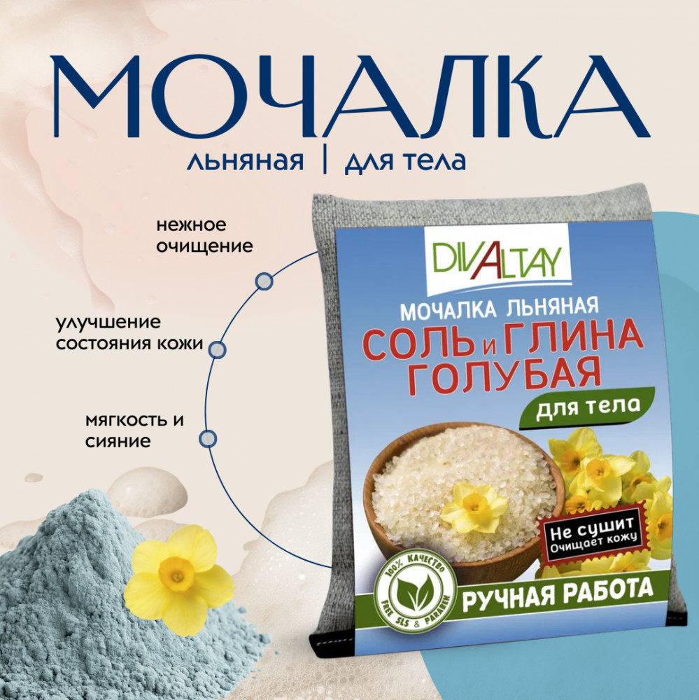 Льняная мочалка для тела «Соль и голубая глина» — это идеальное средство для нежного ухода и очищения кожи тела. Сочетание мягких льняных волокон, соли и голубой глины обеспечивает эффективное и деликатное очищение кожи от грязи, избытка кожного жира и других загрязнений, а также способствует улучшению состояния кожи, устранению несовершенств и приданию ей сияния.