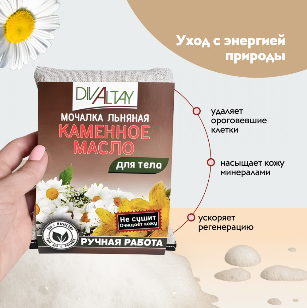 Льняная мочалка для тела «Каменное масло» — это идеальное средство для нежного ухода и глубокого питания кожи тела. Сочетание мягких льняных волокон и экстракта «Каменного масла» обеспечивает эффективное и деликатное очищение кожи от грязи, избытка кожного жира и других загрязнений, а также способствует увлажнению, питанию и улучшению эластичности кожи, делая ее более мягкой, упругой и сияющей.