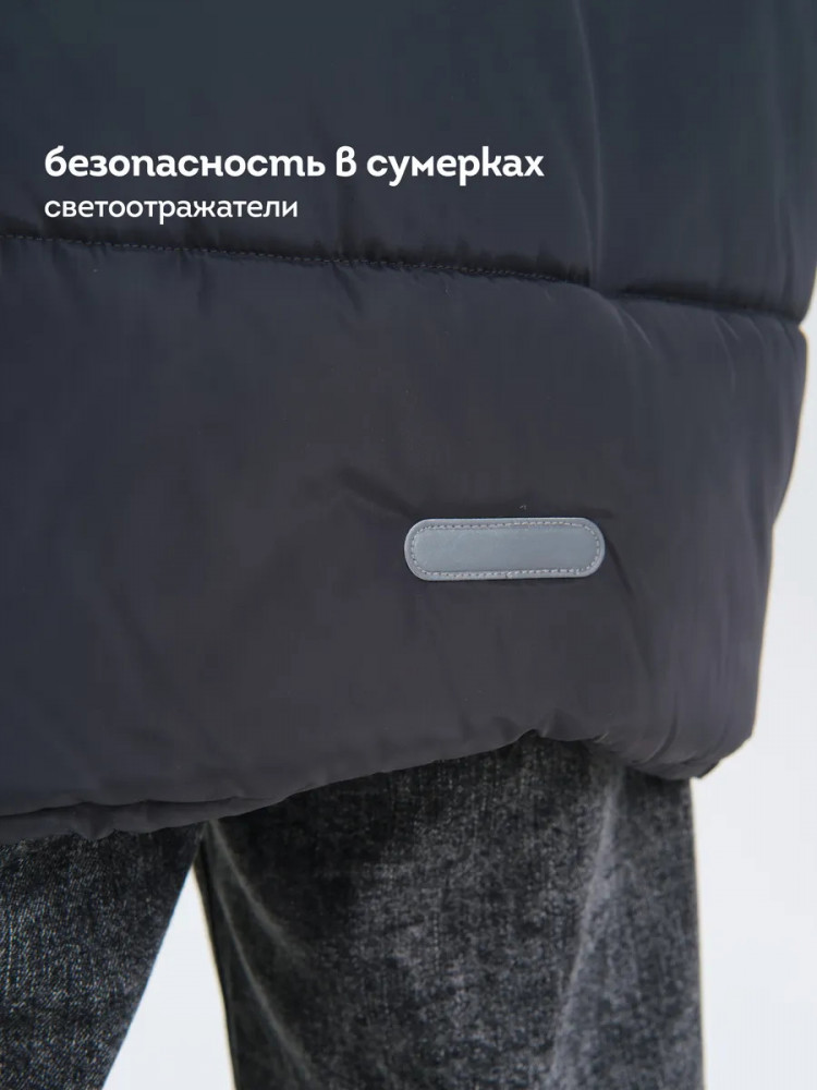 Куртка зимняя для мальчика оснащена несъёмным капюшоном, который надёжно защищает голову и шею от ветра. Центральная молния закрыта ветрозащитной планкой, есть внутренние манжеты, утяжка по низу — все это создаёт защиту от продува. В боковых швах и нижней части спинки расположены светоотражающие элементы для безопасности в темное время суток.