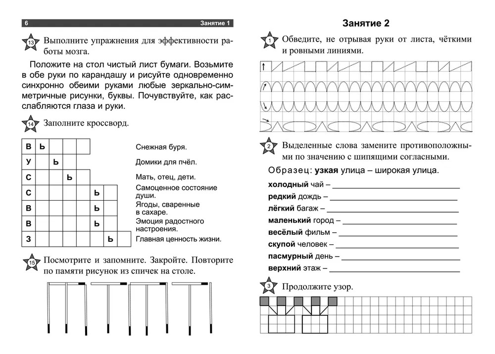 Позаботьтесь о своём мозге и когнитивной активности! И будьте здоровы, счастливы! Регулярные занятия помогут повысить эффективность всех мыслительных процессов, развить и улучшить память, творческое мышление, навык быстро находить самые лучшие решения для сложных жизненных задач. Развивающие задания, игры, упражнения полезны в любом возрасте, но их актуальность и позитивность увеличивается в разы исключительно для людей в возрасте и тех, кто перенёс тяжёлые недуги, потому что с помощью такой тренировки можно поддерживать мозг в активном состоянии, обрести душевное равновесие и социально-психологическую защиту, побороть остаточные явления после болезни, отсрочить старость и даже предотвратить деменцию. Наши логические тетради — один из современных полезных и эффективных способов повышения качества повседневной жизни взрослых в нужном русле их статуса — при восстановлении после физической или психологической травмы, предупреждении заболеваний головного мозга, первых признаках умеренных когнитивных нарушений и др., когда гимнастика для мозга, самостоятельные занятия для ума и концентрации внимания, когнитивная стимуляция, которая заключается в применении определенных упражнений, направленных на поддержание или улучшение памяти, мышления, речи, восприятия информации и воображения, становятся не только необходимым жизненным фактором, и ещё и приятным времяпрепровождением людям, которые могут себе позволить заниматься досугом гораздо больше, чем прежде.