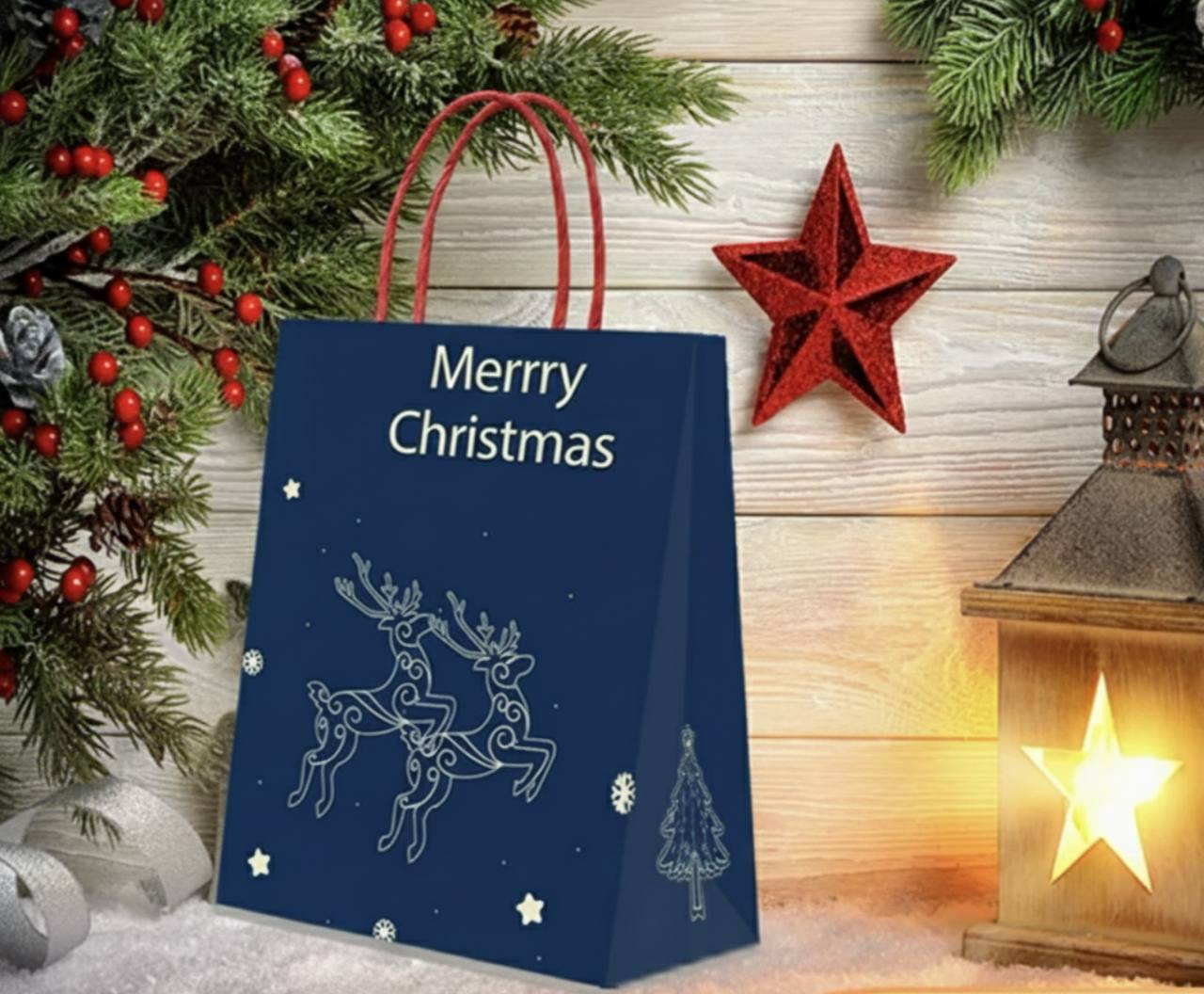 Глубокий тёмно-синий пакет с красными крученными ручками и серебряными оленями, будто нарисованными инеем на звёздном небе. Два сказочных оленя летят над заснеженной ёлочкой, вокруг — лёгкие снежинки и звёздочки. Выглядит дорого, волшебно и очень по-зимнему.