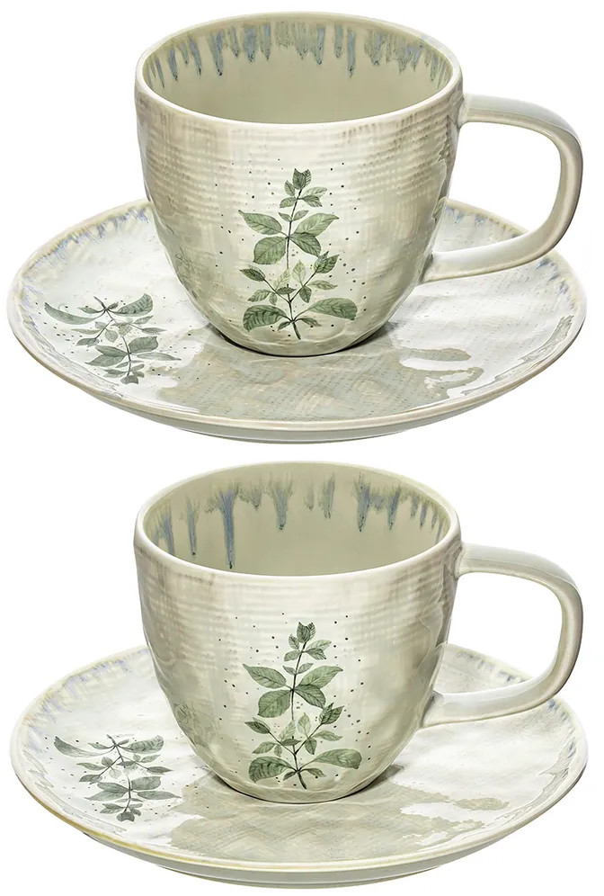 Серия: Лимонная мята Набор 2 чайных пар из серии «Лимонная мята» от Elan Gallery предназначен для эстетичной сервировки вашего стола. Размер каждой ёмкости — 12.5×9х8 см, объём — 280 мл. Размер каждого блюдца — 16.5×16.5×1.5 см. Поверхность изделия украшена изображением ароматной веточки мяты, а ненавязчивый рельеф придаёт ему особую фактурность. Внутренняя сторона кружек и окантовка блюдец украшена рисунком, имитирующим подтёки краски. Оттенки чайных пар слегка различаются: одна имеет более тёплый тон, другая — более холодный. Эта особенность придаёт каждому элементу набора свою индивидуальность, а вместе они образуют особенно гармоничное сочетание. Выполнены из высококачественного фарфора. Он не впитывает цвет напитков и легко отмывается, благодаря чему надолго сохраняет свой оттенок.