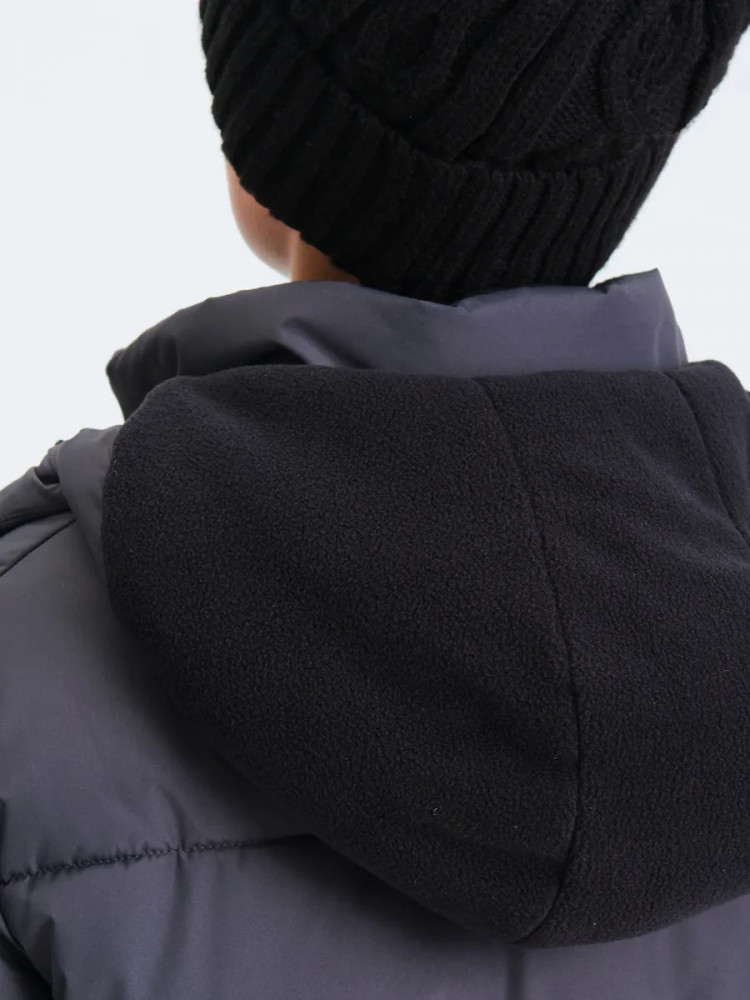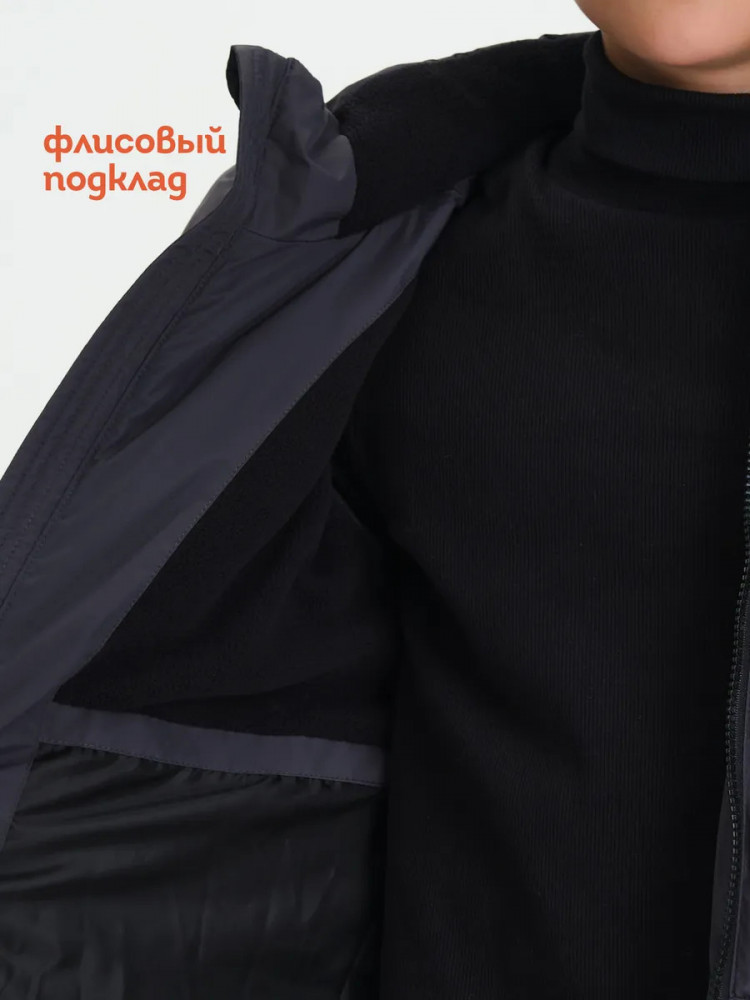Продуманный комфорт обеспечивают многозональный подклад: тёплый флис в верхней части и в капюшоне, а внизу — лёгкий полиэстер, который снижает общий вес изделия и не стесняет движения. Центральная молния с изнаночной стороны закрыта ветрозащитной планкой — это помогает удерживать тепло и защищает от продувания во время прогулок и поездок.