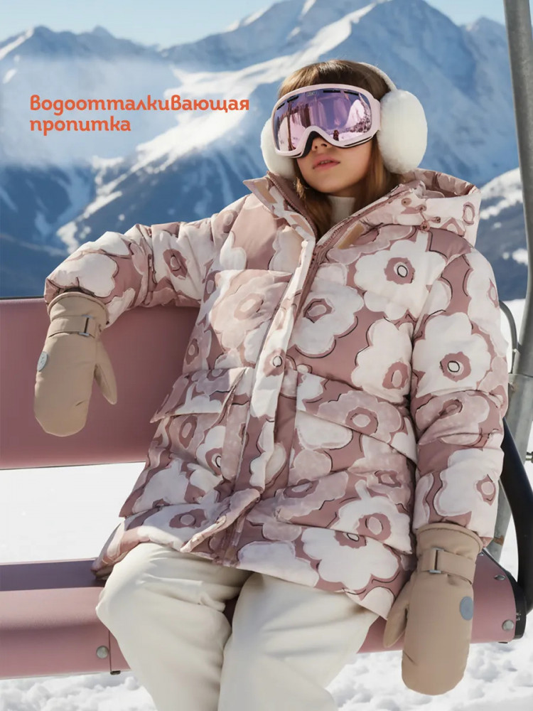 Главная особенность модели — all-over принт с крупными акварельными цветами. Такой дизайн создаёт настроение тепла и уюта, выглядит душевно и одновременно роскошно. Для родителей это плюс: куртка остаётся практичной и защищённой от холода, но при этом подчёркивает индивидуальность ребёнка. Для девочек это возможность чувствовать себя стильной и модной. Это настоящий тренд зимнего сезона, который можно охарактеризовать как «роскошь офлайна».