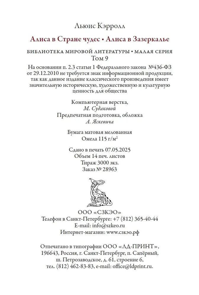💳 Оплатить за товар можно при получении 🇰🇿 Есть бесплатная доставка по Казахстану от 1 дня 🎁 Копите бонусы с каждой покупки Серия: Библиотека мировой литературы (мини) В настоящий сборник вошли знаменитые сказки британского писателя Льюиса Кэрролла (1832-1898) «Приключения Алисы в Стране чудес» и «Сквозь зеркало и что там увидела Алиса, или Алиса в Зазеркалье». «Алиса в Зазеркалье» дополнена не вошедшей в окончательный текст главой «Шмель в парике». Тексты украшены классическими иллюстрациями английского художника Джона Тенниела (1820-1914). Сказки представлены в переводе доктора филологических наук Нины Михайловны Демуровой (1930-2021). |