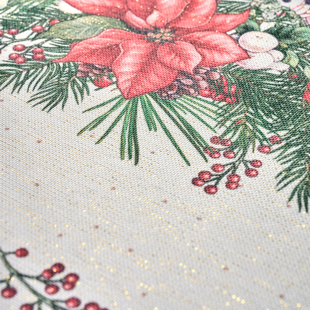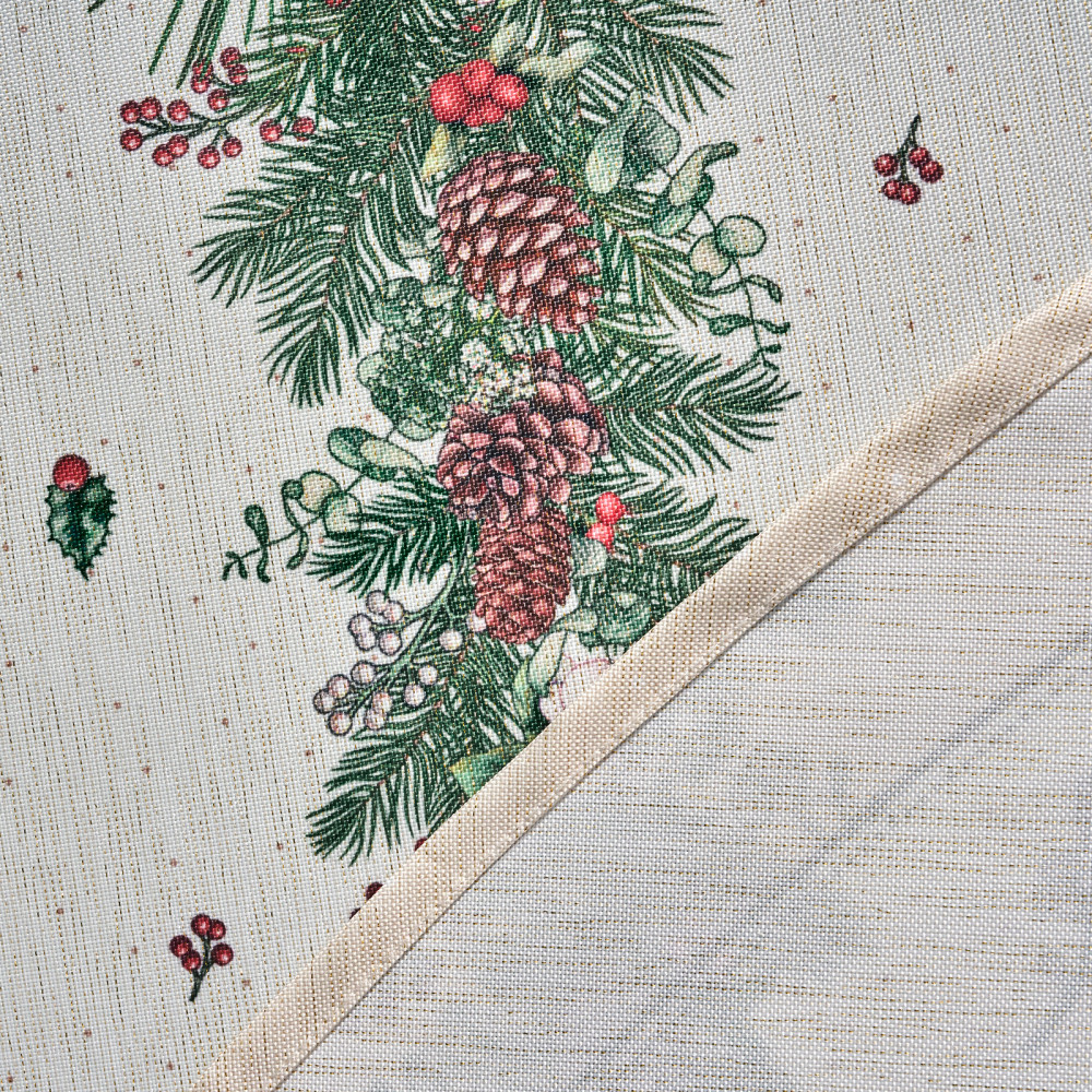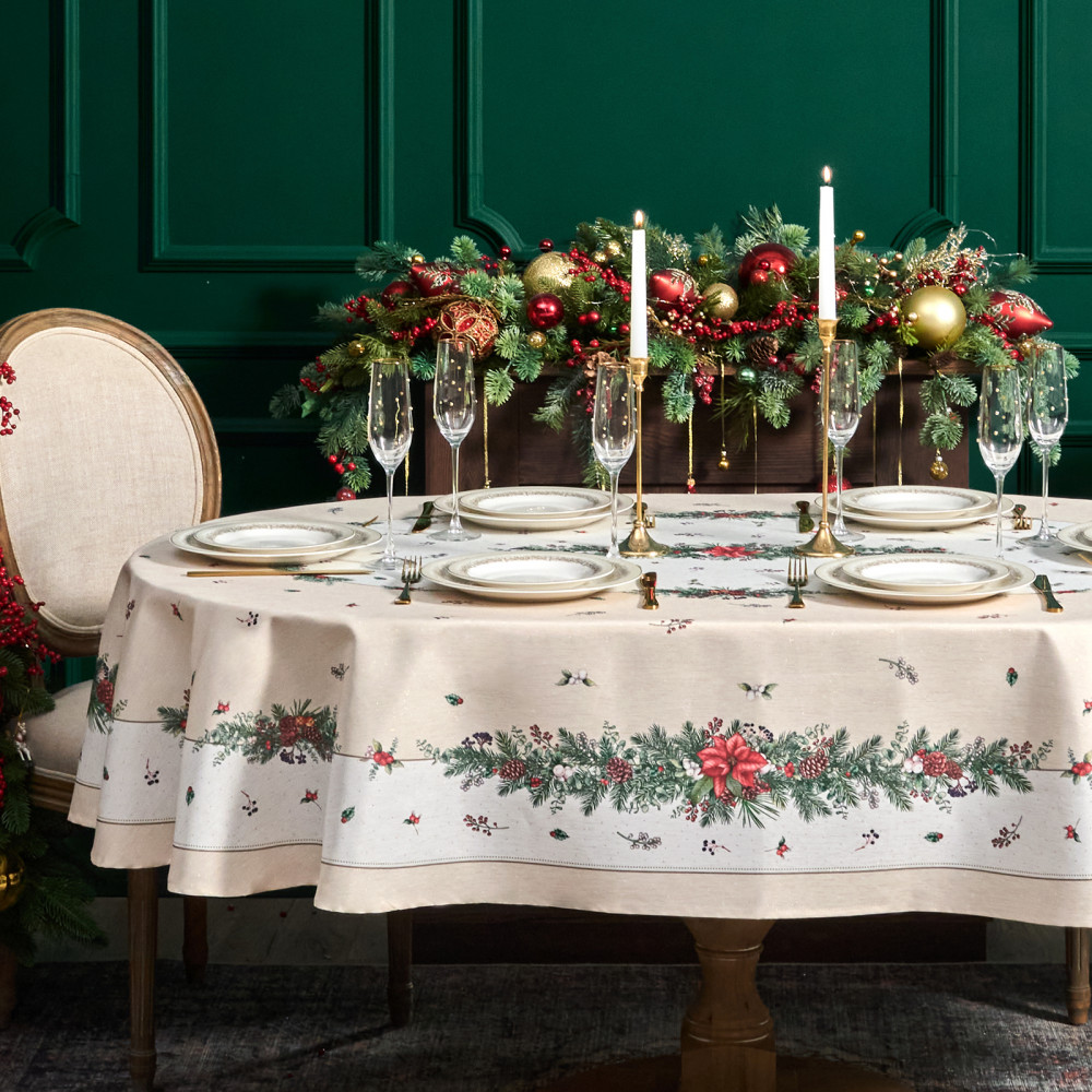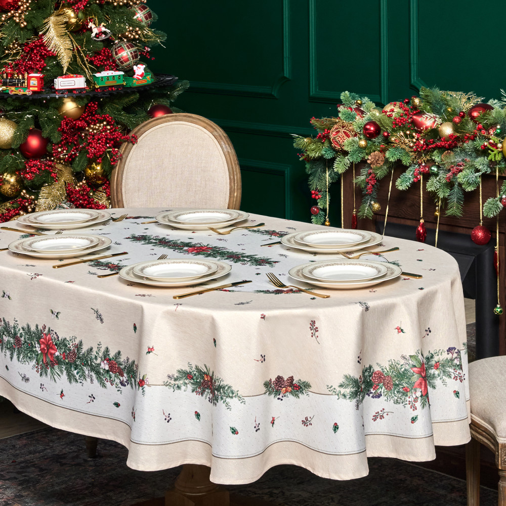 Новогодняя овальная скатерть Lefard из коллекции «Celebration» — элегантное украшение стола и изысканный акцент зимнего интерьера. Она создаёт атмосферу тепла, уюта и ожидания праздника, превращая ужин в красивую семейную традицию. Принт вдохновлён мотивами зимнего леса: еловая зелень, алые ягоды и шишки образуют композицию, напоминающую рождественский венок. Ткань словно хранит свежесть зимнего утра и праздничное настроение.