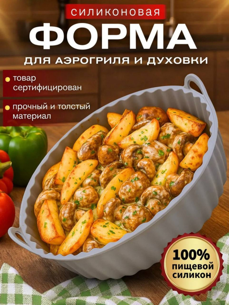 Подходит для всех популярных моделей аэрогрилей (5–8 л) и обычных духовок. Выдерживает температуру до +260 °C, 100 % пищевой силикон премиум-класса.