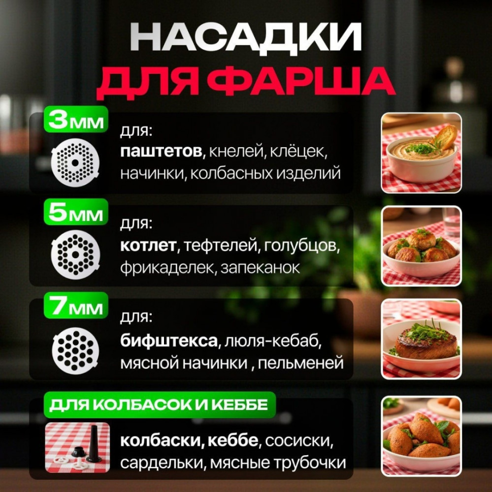 💳 Оплатить за товар можно при получении 🇰🇿 Есть бесплатная доставка по Казахстану от 1 дня 🎁 Копите бонусы с каждой покупки Профессиональная электрическая мясорубка MG204 создана для тех, кто ценит мощность, надежность и удобство на кухне. Усиленный мотор 2200W обеспечивает быструю переработку любых продуктов — от мягкого мяса до грудинки и жил. Корпус и решётки выполнены из нержавеющей стали SUS304, благодаря чему прибор отличается долговечностью, устойчивостью к коррозии и безопасностью для пищевых продуктов. Планетарный редуктор и металлическая шестерня гарантируют стабильную работу без перегрева, а система Reverse помогает справляться с блокировками. Мясорубка оснащена широким загрузочным лотком, удобными кнопками и прозрачным контейнером для фарша, что делает процесс приготовления простым и комфортным. В комплект входят решётки разной толщины, насадка для колбас и кеббе — всё, что нужно для разнообразных домашних блюд. |