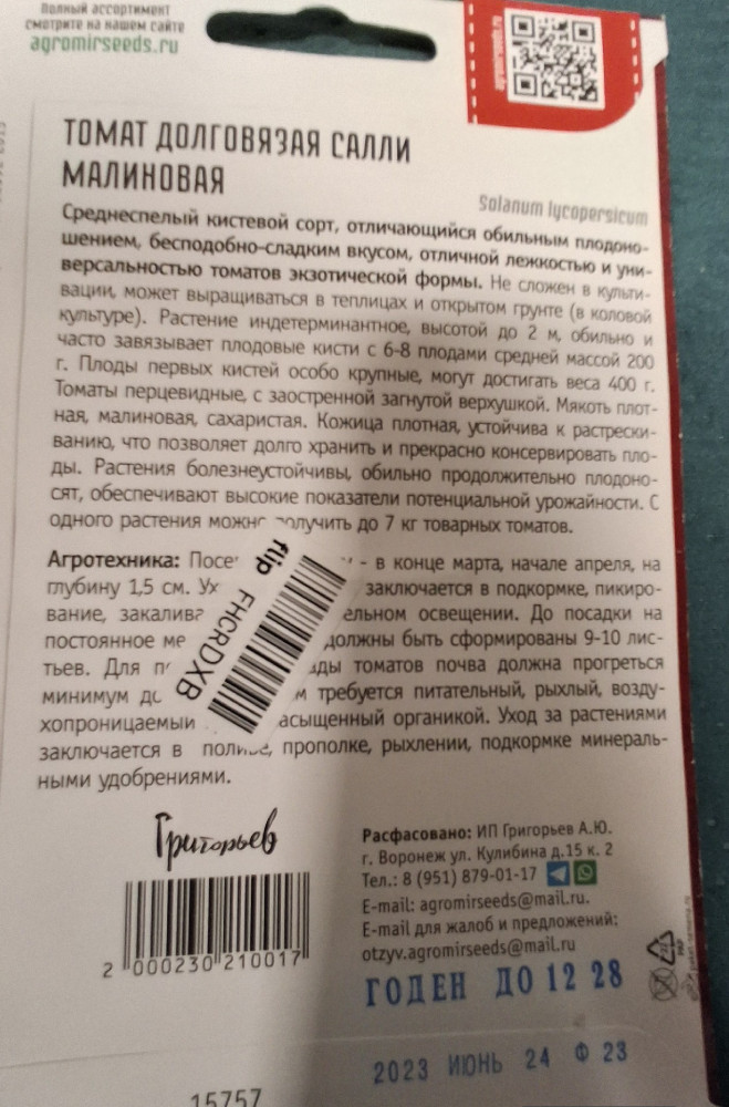 Григорьев Семена томата «Долговязая Салли малиновая»+8 годность хорошая невсхожесть семян несоответствие картинки