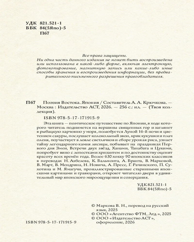 💳 Оплатить за товар можно при получении 🇰🇿 Есть бесплатная доставка по Казахстану 🎁 Копите бонусы с каждой покупки Серия: Твоя коллекция Эта книга — поэтическое путешествие по Японии, в ходе которого читатель поднимется на вершины священных гор и заглянет в рыбацкую харчевню у моря, полюбуется Луной 16-й ночи и цветением сакуры, послушает колокольный звон, крик кукушки и плач оленя, поучаствует в ловле сверчков и сборе урожая риса, узнает тайну легендарного камня лисицы, побывает на праздниках Первого дня Змеи, Встречи двух звёзд, Ханами, Танабата и Цукими, попробует вино с лепестками хризантем и по достоинству оценит красоту всех времён года. Более 630 хокку 90 японских классиков в переводах Н. Азбелева, К. Бальмонта, А. Бранта, В. Марковой, В. Марта, В. Мендрина, Н. Новича, А. Пресс, Г. Рачинского, П. Сухотина и М. Ямагути, проиллюстрированные 125 старинными японскими картинами и гравюрами, откроют читателю двери в удивительный мир японского мироощущения и созерцания. |