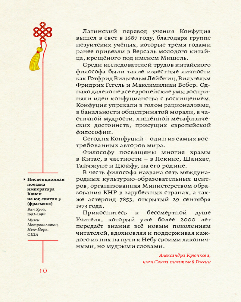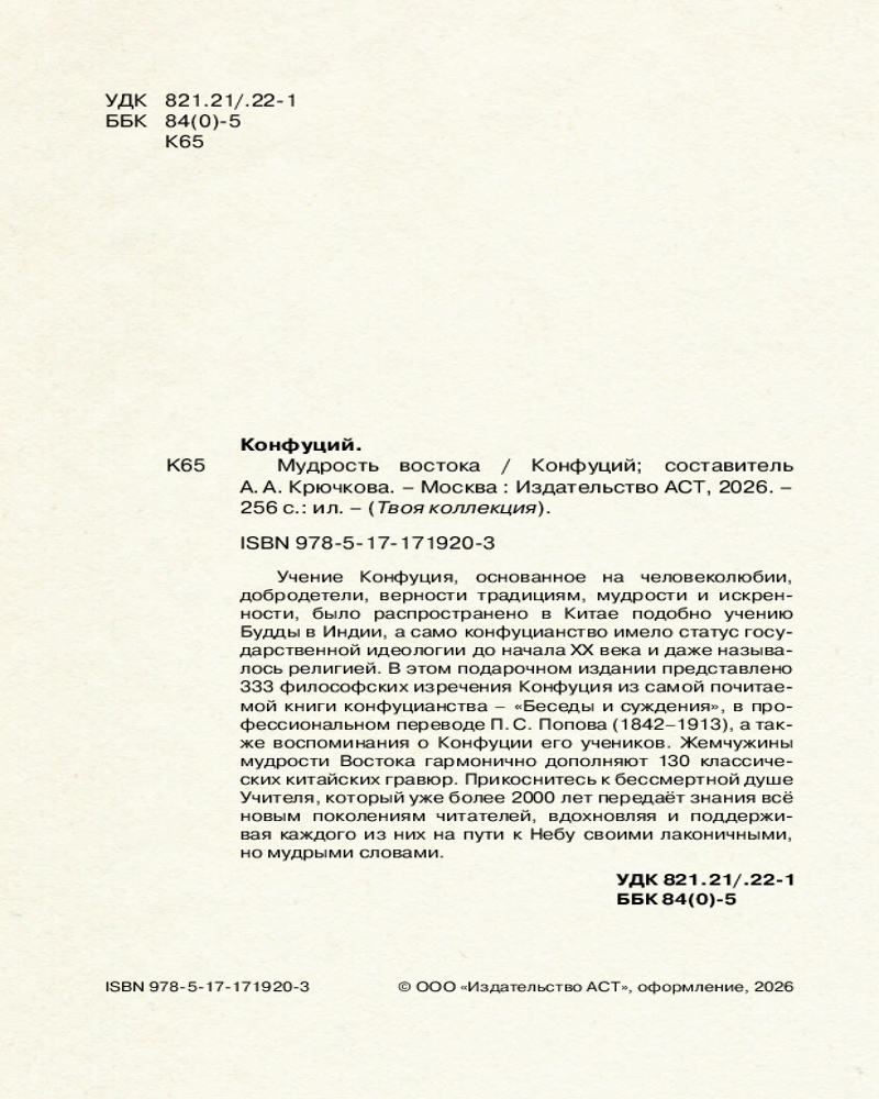 💳 Оплатить за товар можно при получении 🇰🇿 Есть бесплатная доставка по Казахстану 🎁 Копите бонусы с каждой покупки Серия: Твоя коллекция Учение Конфуция, основанное на человеколюбии, добродетели, верности традициям, мудрости и искренности, было распространено в Китае подобно учению Будды в Индии, а само конфуцианство имело статус государственной идеологии до начала XX века и даже называлось религией. В этом подарочном издании представлено более 300 философских изречений Конфуция из самой почитаемой книги конфуцианства — «Беседы и суждения», в профессиональном переводе П. С. Попова (1842-1913), а также воспоминания о Конфуции его учеников. Жемчужины восточной мудрости гармонично дополняют 128 классических китайских гравюр. Прикоснитесь к бессмертной душе Учителя, который уже более 2000 лет передаёт знания всё новым поколениям читателей, вдохновляя и поддерживая каждого из них на пути к Небу своими лаконичными, но мудрыми словами. |