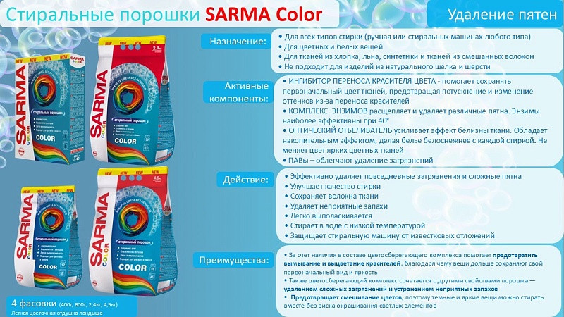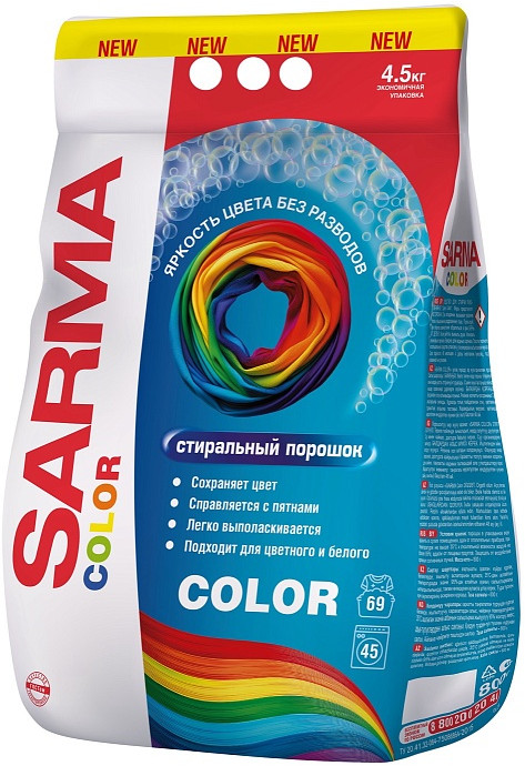 Стиральный порошок «Сарма Color» — это комплексная забота о цветном белье. Он не просто отстирывает вещи, но и активно сохраняет их цвет, мягкость и внешний вид, делая их носку более долгой.