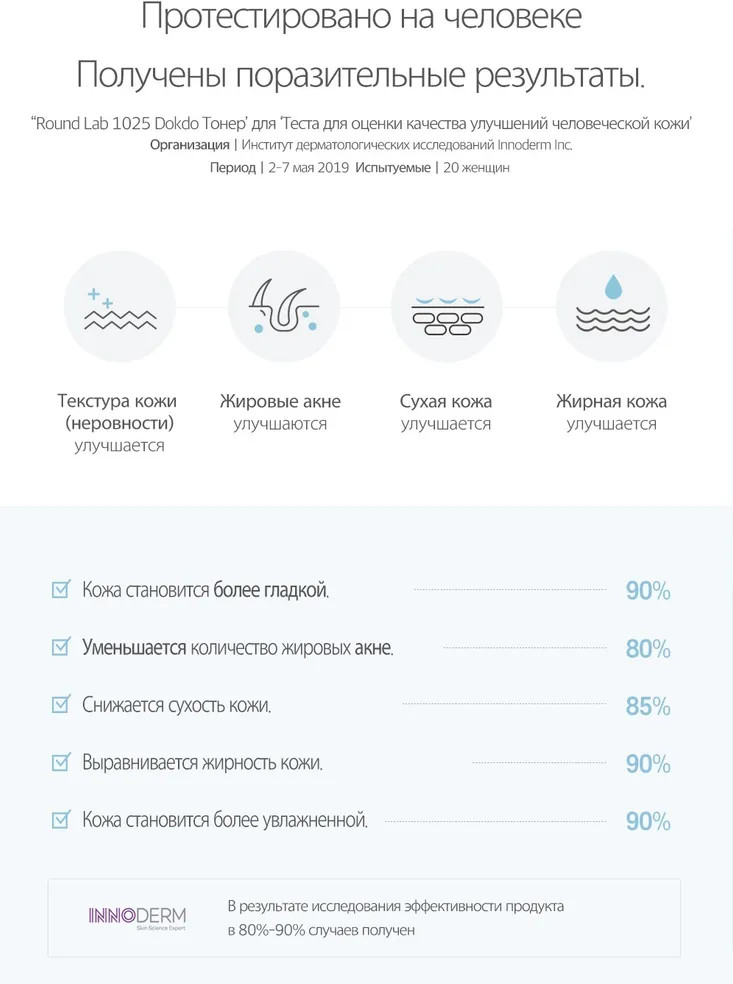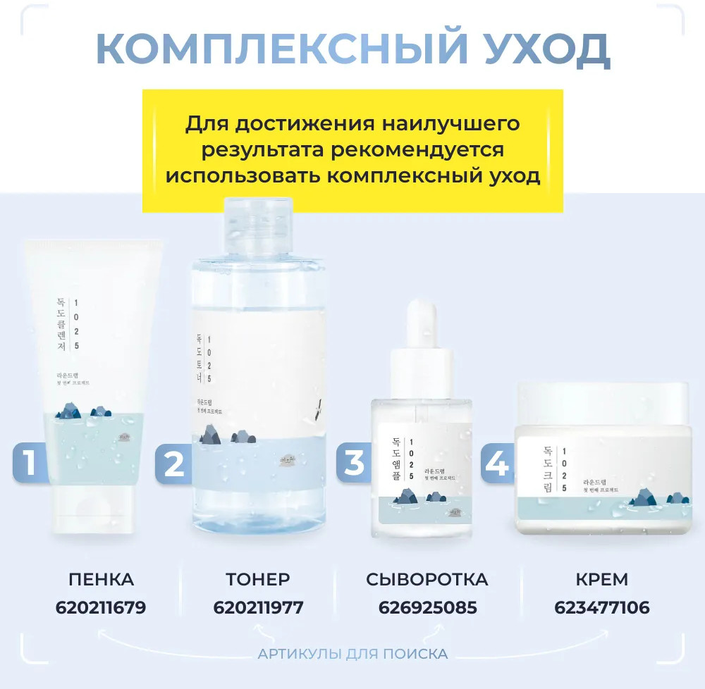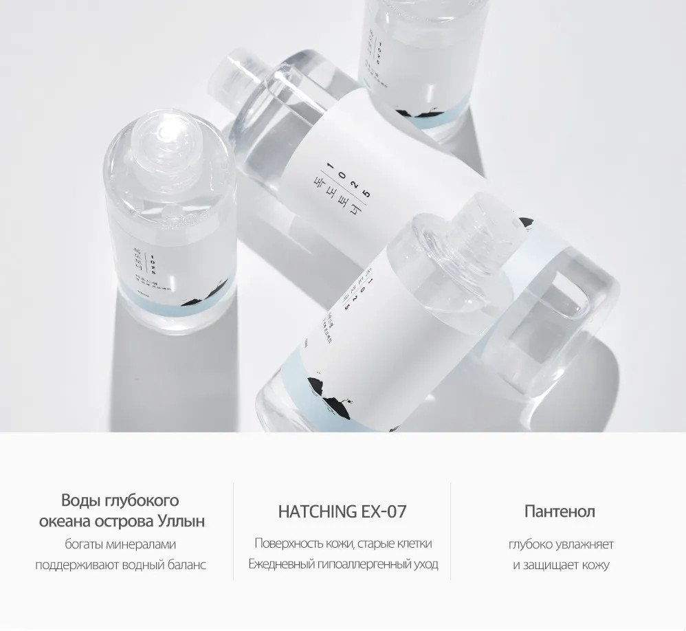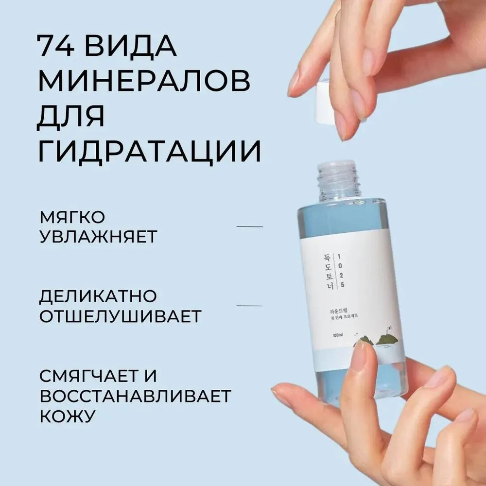 Базовый тонер для ежедневного применения Round Lab 1025 Dokdo Toner — 4 года подряд тонер № 1 в Корее, победитель множества бьюти-премий. Тонер удерживает влагу в коже после умывания, а также увеличивает проницаемость, т.е. помогает быстрее и активнее усвоиться полезным компонентам, которые присутствуют в составе последующих уходовых средств.