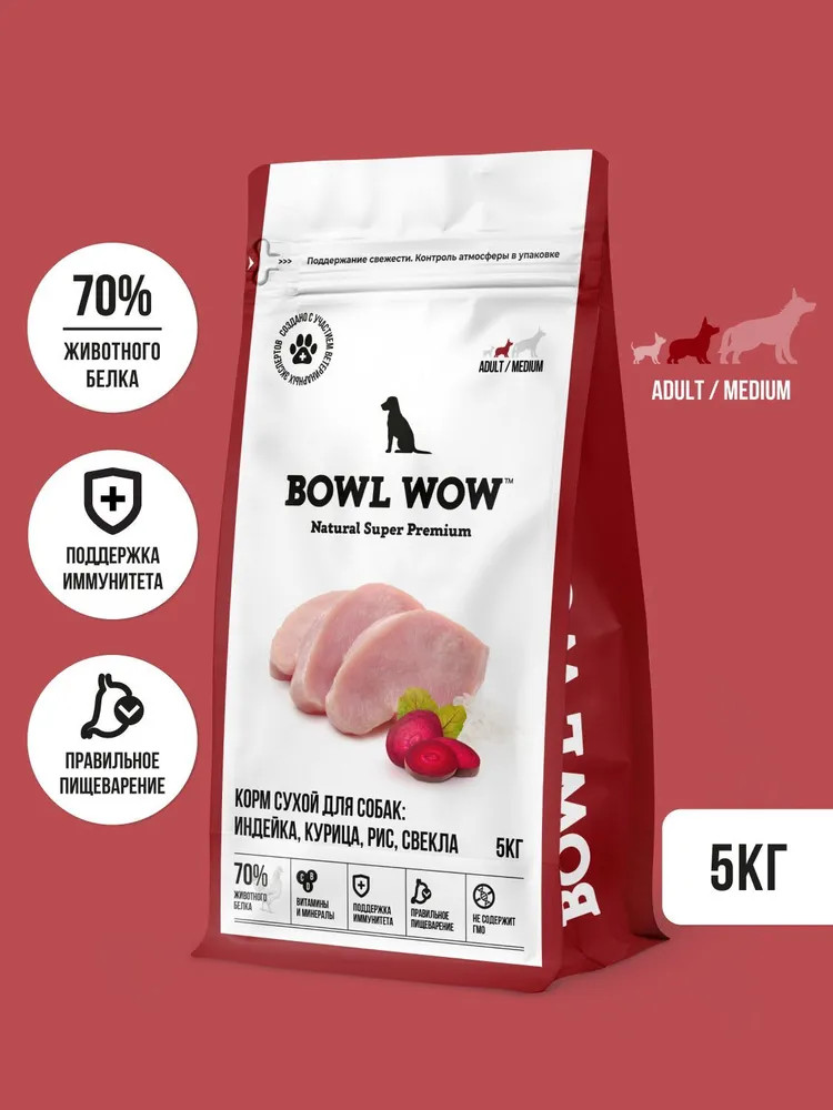 BOWL WOW Сухой корм для собак средних пород с индейкой, курицей и свеклой