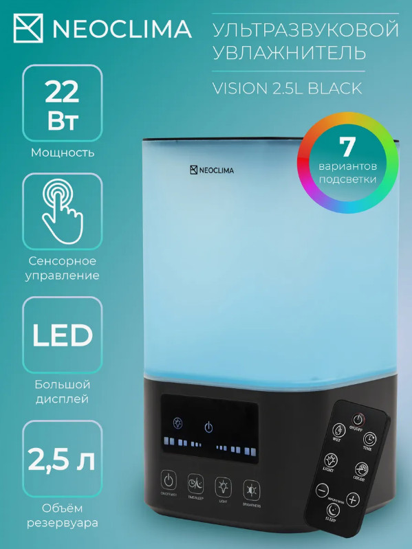 Ультразвуковой увлажнитель воздуха Neoclima Vision-2.5L создаст комфортный микроклимат в доме, квартире и офисе, поддерживая оптимальный уровень влажности в помещении во время отопительного сезона и жаркого лета. А также создаст комфортную атмосферу для растений и цветов. Почти бесшумный [до 35 дБ] и безопасный для ребенка. Современный дизайн позволит увлажнителю вписаться в любой интерьер.