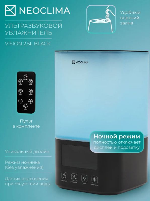 Ультразвуковой увлажнитель Neoclima Vision-2.5L распыляет воду на ультра-мелкие частицы 1-5 мкм, используя принцип ультразвукового высокочастотного колебания, и рассеивает водяной туман в воздух через пневматическое устройство для обеспечения равномерного увлажнения воздуха в помещении без капель и налета на мебели и технике.