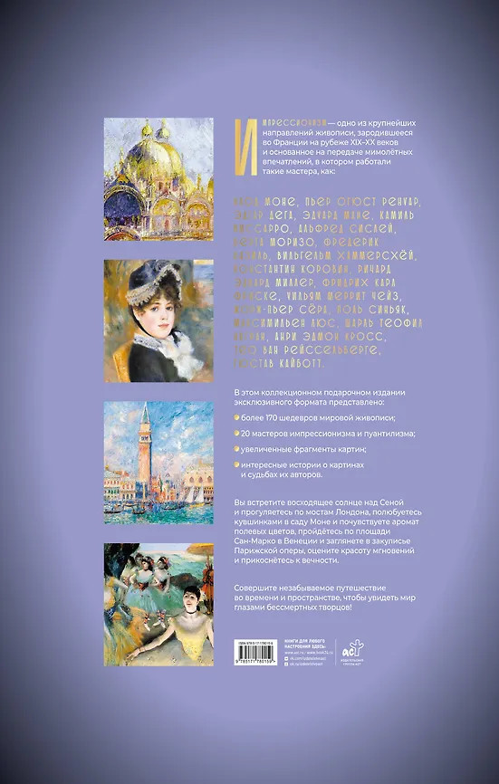 💳 Оплатить за товар можно при получении 🇰🇿 Есть бесплатная доставка по Казахстану от 1 дня 🎁 Копите бонусы с каждой покупки Серия: Эксклюзивный формат. Картинная галерея Импрессионизм – одно из крупнейших направлений живописи, зародившееся во Франции на рубеже XIX–XX веков и основанное на передаче мимолётных впечатлений, в котором работали такие мастера, как Клод Моне, Пьер Огюст Ренуар, Эдгар Дега, Эдуард Мане, Камиль Писсарро, Альфред Сислей. В коллекционном подарочном издании эксклюзивного формата представлено более 170 мировых шедевров великих мастеров импрессионизма и пуантилизма, а также увеличенные фрагменты картин и интересные истории о судьбах их авторов. Вы встретите восходящее солнце над Сеной и прогуляетесь по мостам Лондона, полюбуетесь кувшинкам в саду Моне и почувствуете аромат полевых цветов, пройдётесь по площади Сан-Марко в Венеции и заглянете за кулисы Парижской оперы, оцените красоту мгновений и прикоснётесь к вечности. Совершите незабываемое путешествие во времени и пространстве, чтобы увидеть мир глазами бессмертных творцов! |