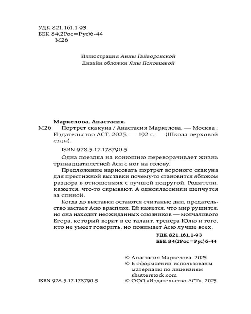 💳 Оплатить за товар можно при получении 🇰🇿 Есть бесплатная доставка по Казахстану 🎁 Копите бонусы с каждой покупки Серия: Школа верховой езды Одна поездка на конюшню переворачивает жизнь тринадцатилетней Аси с ног на голову. Предложение нарисовать портрет вороного скакуна для престижной выставки почему-то становится яблоком раздора в отношениях с лучшей подругой. А одноклассники шепчутся за спиной. |