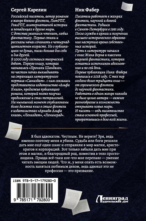 💳 Оплатить за товар можно при получении 🇰🇿 Есть бесплатная доставка по Казахстану от 1 дня 🎁 Копите бонусы с каждой покупки Серия: Коллекция фантастики Я был адвокатом. Честным. Не верите? Зря, ведь именно поэтому меня и убили. Судьба или боги решили дать мне ещё один шанс и отправили в мир магии, аристократов и корпораций. Вот только забыли дать мне при этом и магию, и благородный род, поместив в тело простолюдина. Правда, всё-таки кое-что мне перепало — умение читать эмоции людей. Что ж, у меня опять есть возможность заняться любимым делом, ведь адвокат — это не профессия, это призвание. |