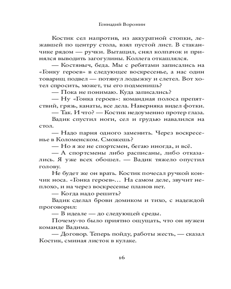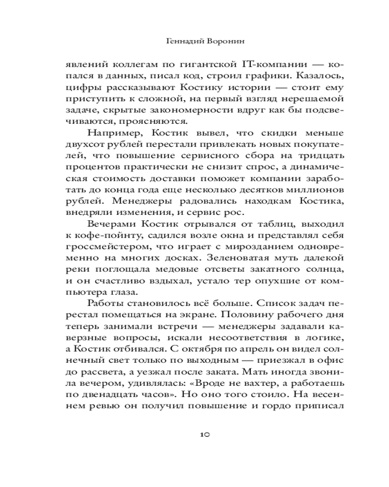 | Геннадий Воронин (р. 1993) — прозаик; живет в Москве, работает руководителем проектов в Яндексе. Выпускник Creative Writing School. |