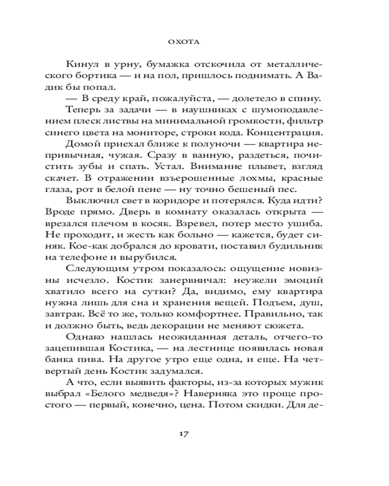 💳 Оплатить за товар можно при получении 🇰🇿 Есть бесплатная доставка по Казахстану 🎁 Копите бонусы с каждой покупки Серия: Роман поколения «Нарушение порядка» — три истории о том, как ведет себя человек, когда ломается его привычная картина мира. В повести «Охота» герой пытается решить жизнь как уравнение. Если каждый поступок имеет причину и всё предопределено, можно ли просчитать судьбу? «В шкафу» — про слепую материнскую любовь и попытку ответить на вопрос: что страшнее — потерять близкого или понять, что он всегда был другим? В «Стёклах» университетский профессор узнаёт диагноз, который рушит не только его планы, но и привычный образ самого себя. |
