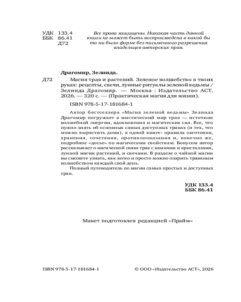 Магия трав и растений. Зелёное волшебство в твоих руках. Рецепты, свечи, лунные ритуалыВ данный момент этот товар отсутствует в продаже. Возможно, у нас найдется аналогичный или похожий товар здесь. Серия: Практическая магия для жизни Книга для тех, кто уже встал на путь зеленой ведьмы и кто готов к глубинному погружению в специфику работы с травами. Автор выбрала самые популярные и доступные травы, раскрыв магический потенциал которых, вы сможете изменить свою жизнь. Магическое досье на сами травы, их сочетания между собой, а также с камнями, кристаллами и свечами, правила заготовки, использования и хранения, чайная магия — все аспекты магического травоведения будут вам подвластны. Книга снабжена краткими таблицами-подсказками, списком противопоказаний и другими справочными материалами. |