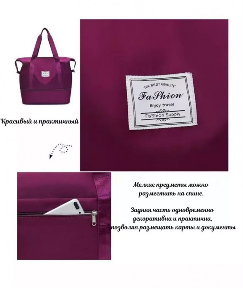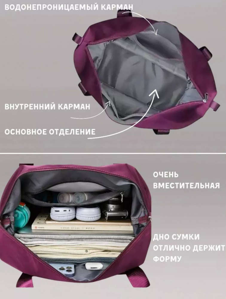 Легкая и вместительная, она вмещает в себя все вещи для тренировок, пляжа или дорогу. Благодаря качественному нейлону, наша сумка непромокаема и водонепроницаема, что облегчит использование в тренажерном зале и на улице. Данная модель может быть использована как женская или мужская — и благодаря универсальному дизайну идеально подойдет как для взрослого, так и подростка, мальчика, девочки, девушки, мамы. Отличная вместительность позволит взять с собой все для подростковой тренировки, от бутылки воды до футбольных мячей. Важным является преимущество носить сумку не только пользуясь ручками, но и на плече. Помимо этого в нашем саквояже есть крепление для чемодана, что упрощает его использование в перелетах. Это идеальная багажная нейлоновая сумка. Текстильная конструкция раскладывающиеся сумки трансформер позволяет удобно складываться, после чего небольшая дорожная черная сумочка уже не занимает много места в багажнике. Подкладка повседневной сумки выполнена из высококачественного полиэстера и ткани с пропиткой. На передней стороне стильной сумки расположены внешние карманы на молнии для аксессуаров и небольших вещей, одежды или обуви. Наша популярная модная сумка отлично подойдет для посещения танцев, художественной гимнастики, плавания, сауны, бани, купания в бассейне, йоги или любого другого вида физкультуры. Благодаря своим размерам, эта сумка отлично подойдет и для путешествий, как ручная кладь, в самолете или поезде, даже в таких строгих авиакомпаниях, так и для поездок на машине или в роддом. Независимо от того, планируете вы тренировку в спортзале или поездку на пляж, классическая сумка будет вмещать через все ваши принадлежности, кроссовки и форму. Также маленькая снаружи, но большая и объемная внутри тканевая сумочка легко уместит в себе любые виды экипировки, будь то пляжная, тренировочная или любая другая.