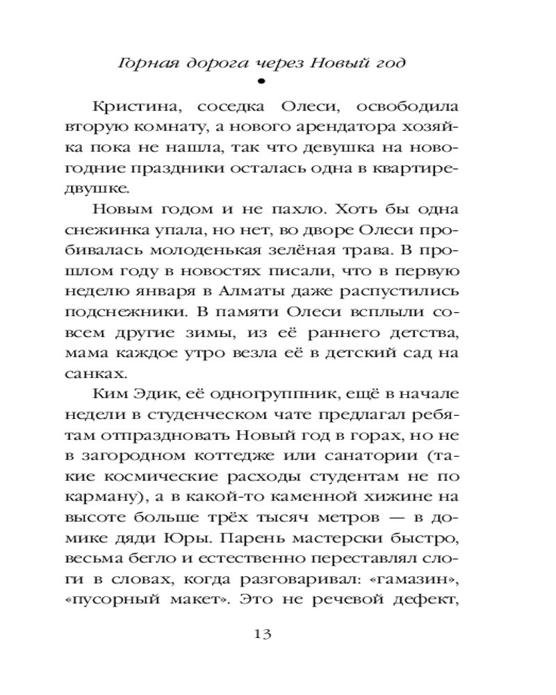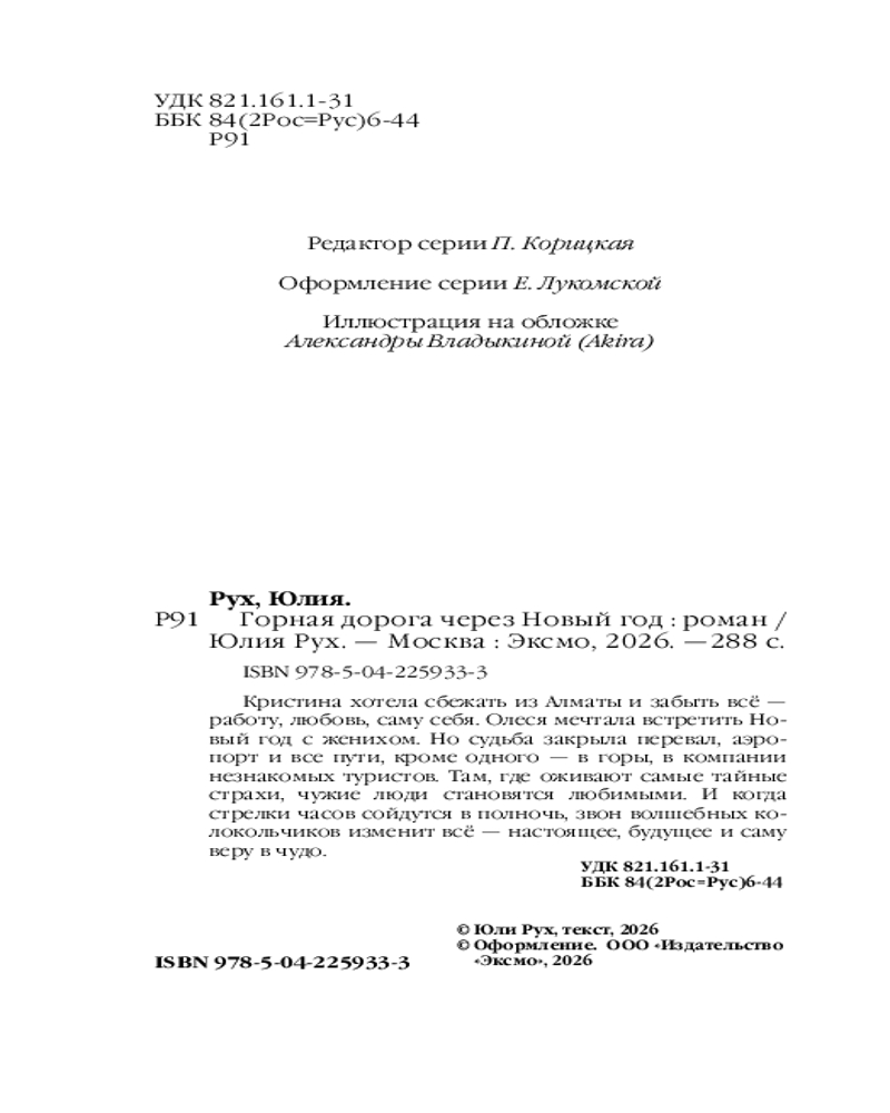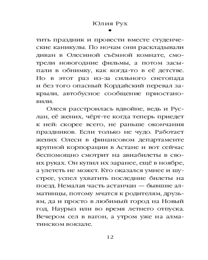 💳 Оплатить за товар можно при получении 🇰🇿 Есть бесплатная доставка по Казахстану 🎁 Копите бонусы с каждой покупки Серия: Ты — мой дом. Теплые истории о любви Кристина хотела сбежать из Алматы и забыть всё — работу, любовь, саму себя. Олеся мечтала встретить Новый год с женихом. Но судьба закрыла перевал, аэропорт и все пути, кроме одного — в горы, в компании незнакомых туристов. Там, где оживают самые тайные страхи, чужие люди становятся любимыми. И когда стрелки часов сойдутся в полночь, звон волшебных колокольчиков изменит всё — настоящее, будущее и саму веру в чудо. |
