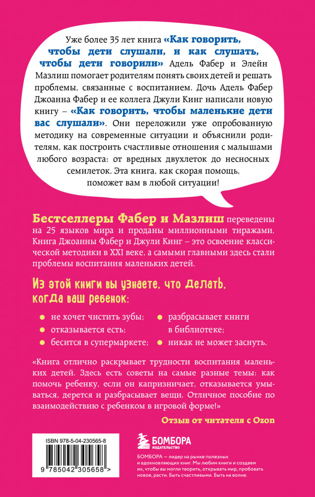 💳 Оплатить за товар можно при получении 🇰🇿 Есть бесплатная доставка по Казахстану 🎁 Копите бонусы с каждой покупки Серия: Мировые бестселлеры по воспитанию от Фабер и Мазлиш Книга Джоанны Фабер и Джули Кинг «Как говорить, чтобы маленькие дети вас слушали» — это освоение классической методики в XXI веке, а самым главным здесь стали проблемы воспитания маленьких детей. Книга родилась по многочисленным просьбам родителей. Они хотели получить больше примеров и советов по воспитанию именно маленьких детей. Капризные двухлетки, разрушительные трехлетки, невыносимые четырехлетки, отчаянные пятилетки, эгоцентричные шестилетки и семилетки, которые периодически ведут себя как дикари! Эта книга — неиссякаемый источник идей, из которого родители всегда могут что-то почерпнуть, если терпение грозит вот-вот лопнуть! |