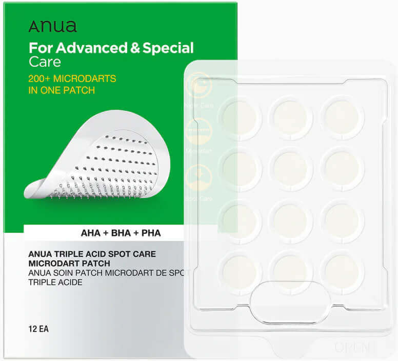 Точечные патчи с кислотами Anua Triple Acid Spot Care Microdart Patch разработаны для более глубокого воздействия на воспаления. На поверхности каждого патча толщиной 0,3 мм содержится более 200 мелких игл, которые обеспечивают направленную доставку активных компонентов, помогают повысить эффективность ухода. Средство способствует очищению пор, успокаивает раздраженную кожу, уменьшает красноту в области воспаления, выравнивает микрорельеф. Подходит для всех типов кожи.