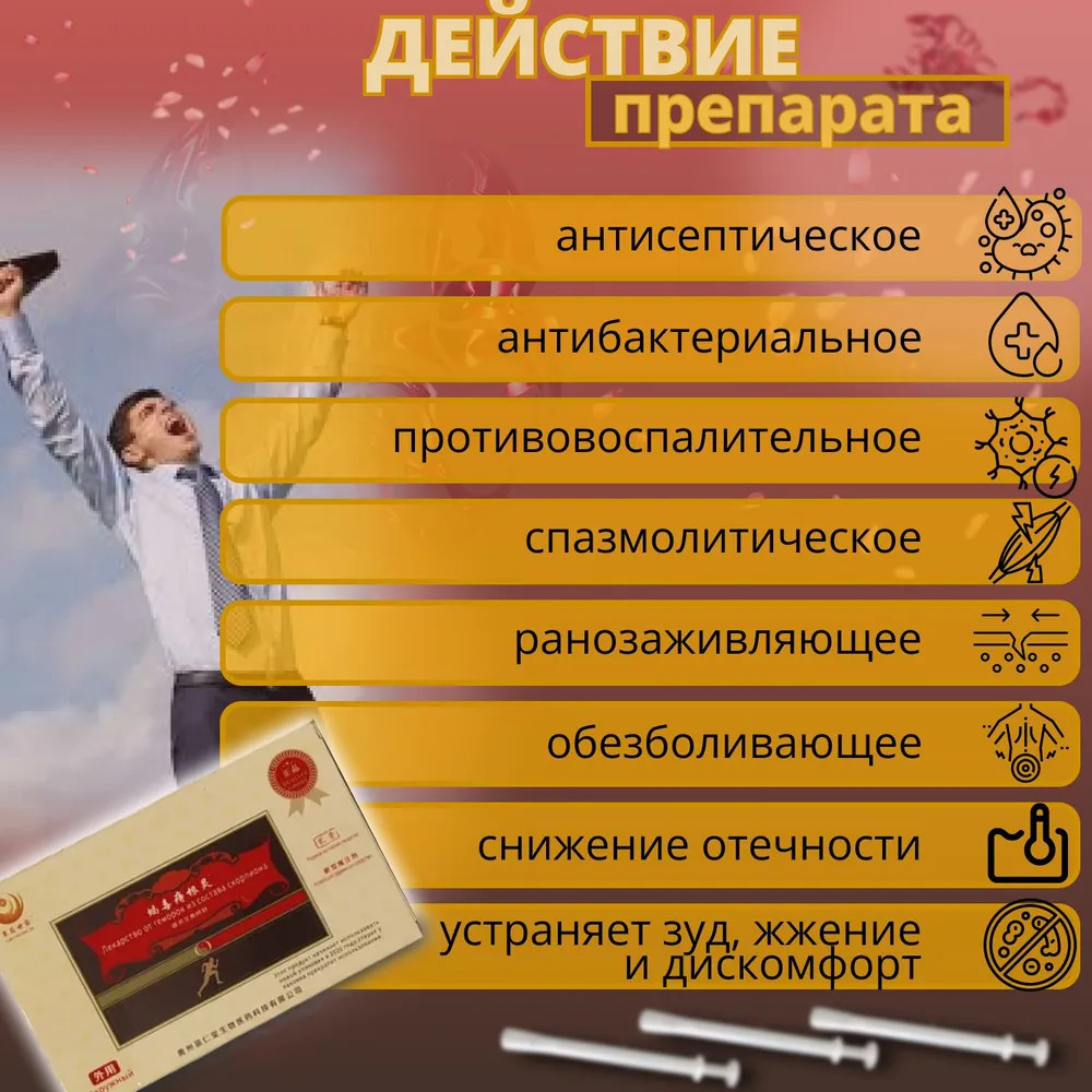 Средство от геморроя в шприцах «Мяолинленцишу». При воспалении геморроидальных узлов некоторые люди предпочитают использовать китайские шприцы от геморроя. В шприцы добавляется специализированная лечебная эмульсия «Скорпион», обладающая противовоспалительным эффектом. Лечебный эффект препарата от геморроя направлен на максимально ускоренное облегчение сразу по нанесении на пораженные зоны. Дает эффект охлаждения, который устраняет зуд, жжение в зоне анального прохода, убирает ощущение боли и снимает процесс воспаления. Средство против геморроя рекомендуется для применения на каждой из стадий заболевания, о них есть много положительных сведений относительно эффективности применения даже в самых сложных случаях.