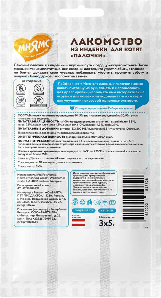 Мнямс Лакомые палочки для котят из индейки