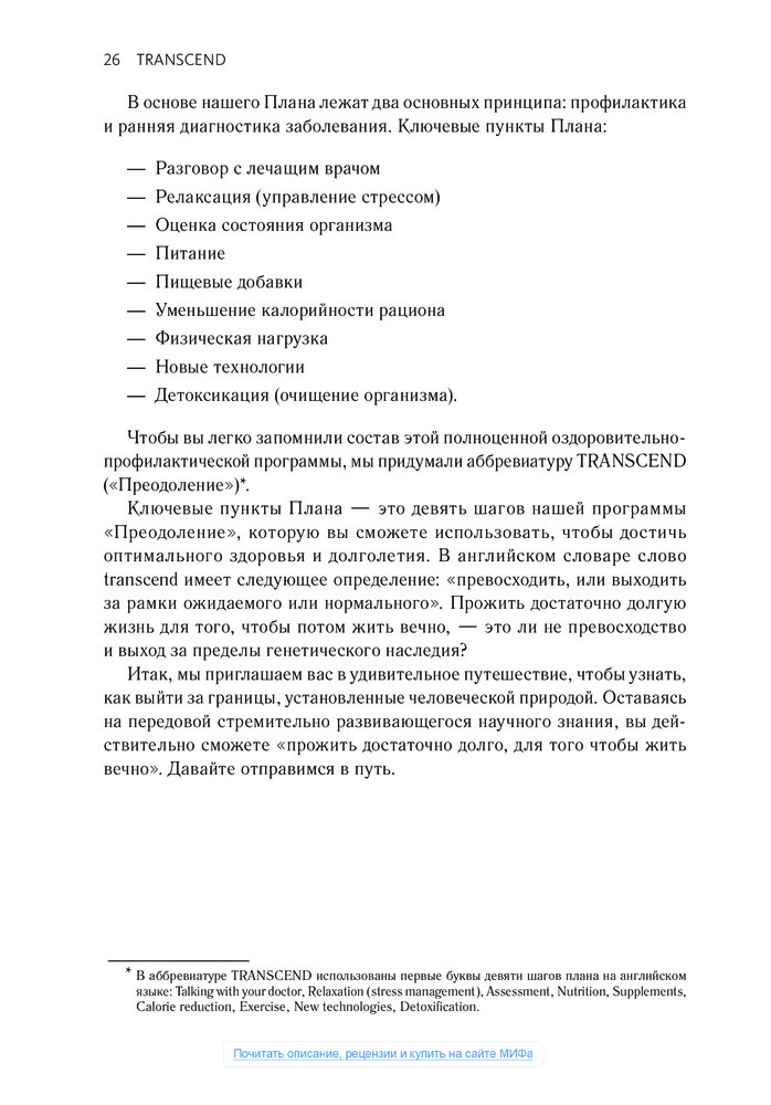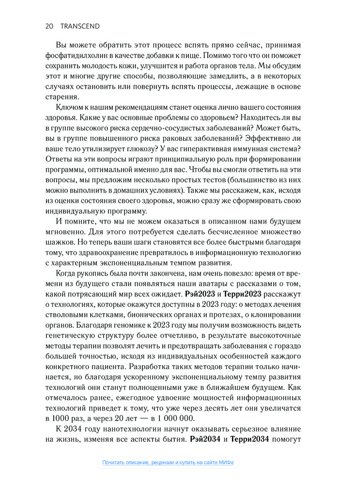 Transcend. Девять шагов на пути к вечной жизниВ данный момент этот товар отсутствует в продаже. Возможно, у нас найдется аналогичный или похожий товар здесь. Научно обоснованная программа, которая позволит прожить достаточно долго, чтобы жить вечно. |