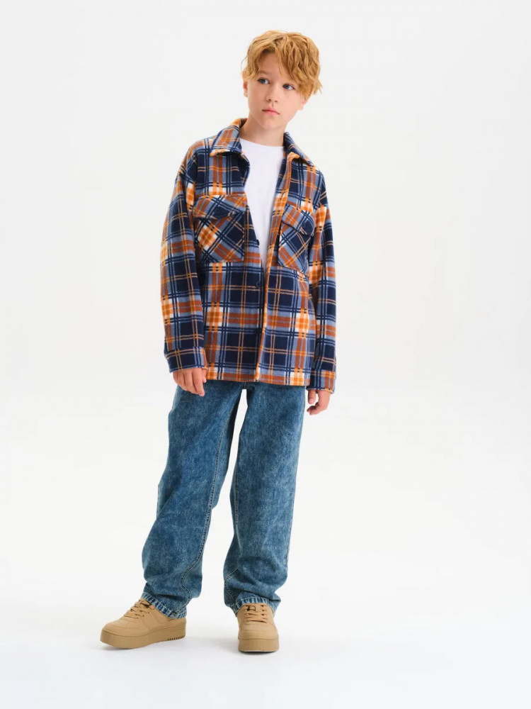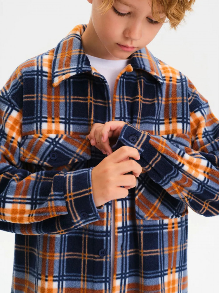 Флисовая рубашка для мальчика. Объёмная рубашка с классическим отложным воротником и спущенным плечом подарит ребёнку комфорт и станет стильным дополнением гардероба. Флисовая рубашка для мальчика. Объёмная кофта с классическим отложным воротником и спущенным плечом подарит ребёнку комфорт и станет стильным дополнением гардероба. Клетчатая утепленная рубашка оверсайз — актуальный модный тренд. Модель застёгивается на пуговицы по переду. По низу рукавов манжеты на пуговицах. По переду слева и справа накладные карманы для мелочей. Флис тёплый, мягкий, лёгкий, просто стирается и быстро сохнет, не выгорает и не скатывается, одежда из него надолго сохраняет прекрасную форму. Отлично подойдет для прохладной осенней погпды в качестве толстовки.Флисовая детская одежда подходит для любого сезона. Флисовая толстовка - это универсальная осенняя одежда для детей, которую можно использовать в качестве поддевы к комплекту верхней мембранной одежды в холодное время года. Поддева для детей сохранит тепло в самые холодные и ветреные дни. Кроме того, флисовая кофточка может быть использована как одежда на осень и весну, а также как верхняя одежда в прохладные летние вечера.