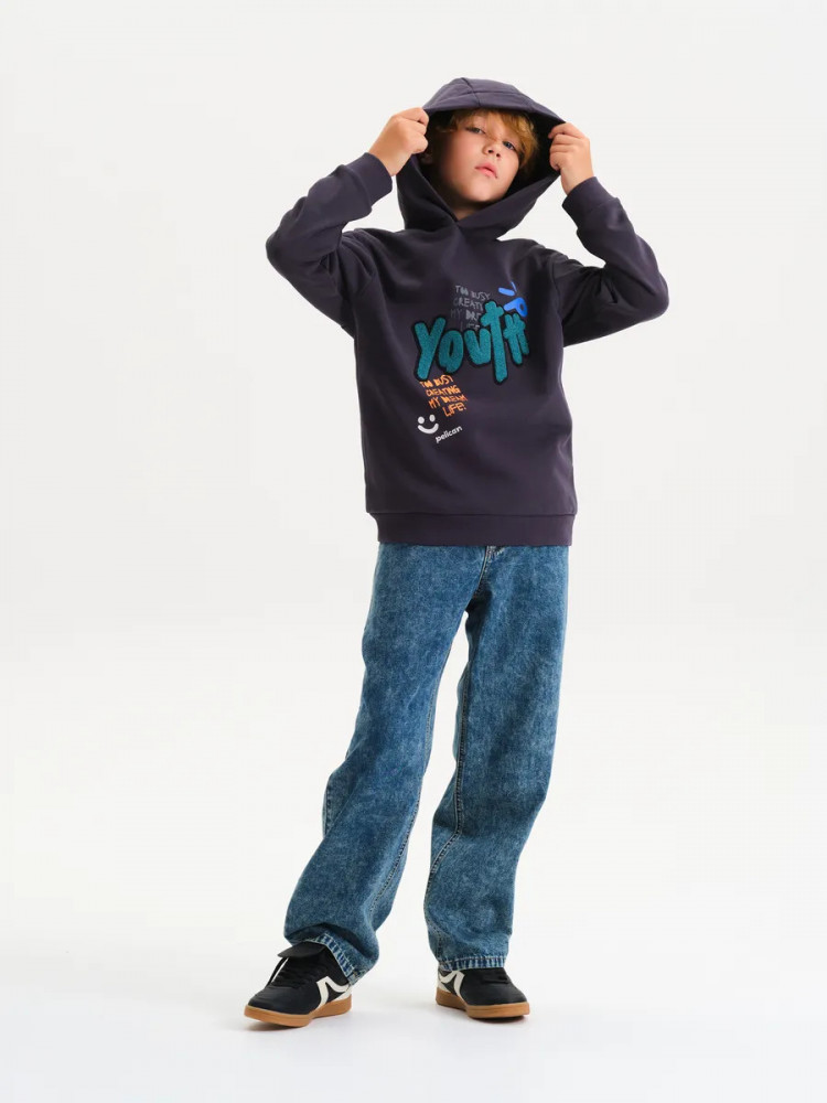 Толстовка детская из футера с начёсом для мальчика. Худи трендового умеренного объема со спущенным плечом подарит ребёнку комфорт и не будет стеснять его движений. Толстовка с капюшоном защитит от холода и ветра. Модель дополнена манжетами из эластичной рибаны по низу и рукавам. Рибана не растягивается и надолго сохраняет отличный внешний вид. Изделие неприхотливо в уходе. Толстовка на мальчика выполнена из ткани с высоким содержанием хлопка — модель приятная на ощупь, дышащая и гипоаллергенная. Благодаря полиэстеру худи износостойкое, сохраняет форму даже после множества стирок. Изделие выполнено в универсальной расцветке, легко комбинируется с любыми брюками, джинсами. Толстовка декорирована оригинальным принтом и нашивкой. Перевод: Молодость. Слишком занят созданием жизни своей мечты". Отличное худи для мальчиков дошкольного и младшего школьного возраста, а также подростков. Джемпер подходит для детского сада, прогулок, отдыха, дома. Худи с капюшоном для мальчика подходят для круглогодичной носки. Помните о правильном уходе за изделием: рекомендуется стирать при температуре не выше 30 °C, без предварительного замачивания, с изнанки. Это поможет сохранить качество и цвет толстовки на длительное время.