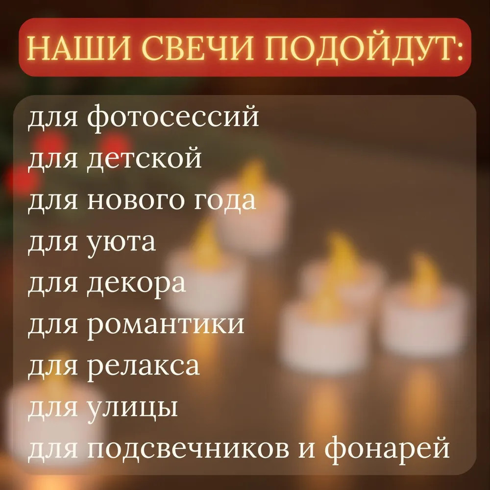 Электронные светодиодные свечи — отличное решение для декора интерьера дома, праздничного стола, романтического свидания или свадьбы. Декоративное светодиодное освещение — это простой и оригинальный способ создать уютную атмосферу не только дома, в спальне или на даче, но и в торговом центре или кафе. Светодиодные LED свечи создадут уютную атмосферу праздника, будь то Новый год, День рождения, День Влюбленных, отлично подойдут для фотосессии. Это абсолютно беспламенный, бездымный и безопасный способ для декора помещения к празднику!