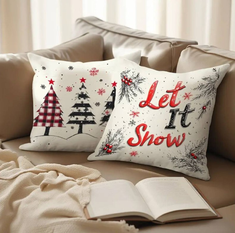 Стильный и уютный комплект из двух праздничных наволочек, который мгновенно наполнит дом атмосферой зимней сказки и тёплого Рождества. Первая наволочка — три нарядные ёлочки в трендовой красно-чёрной клетке Buffalo Plaid и классические чёрные силуэты на белоснежном фоне. Вторая — вдохновляющая надпись «Let It Snow» в изящном каллиграфическом стиле, украшенная еловыми ветками, красными ягодами и нежными снежинками.