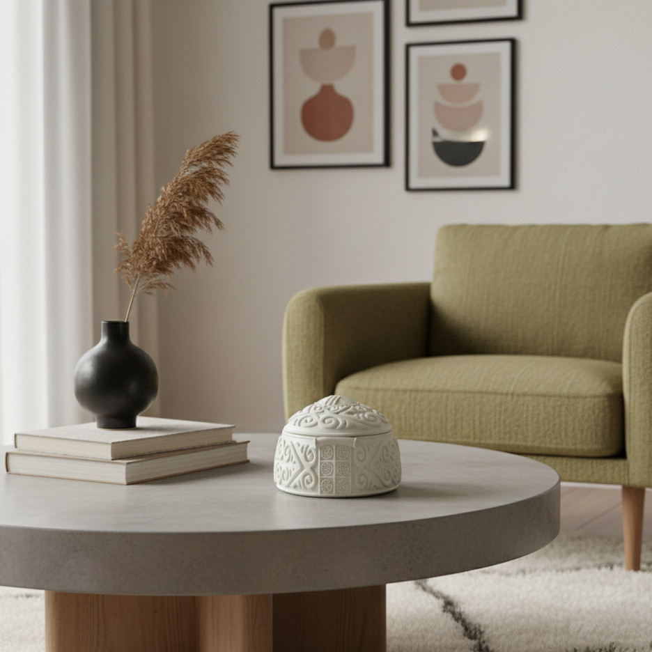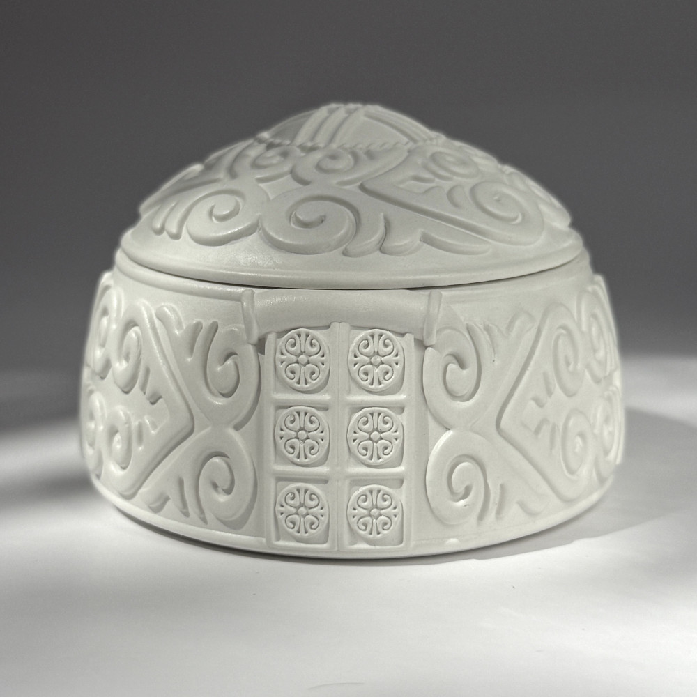 Форма юрты выполнена из высокопрочного гипса с тщательно проработанным, высокодетализированным орнаментом, который придаёт изделию особую изысканность и отражает дух традиций. Внутренняя поверхность обработана защитным лаком, а снаружи нанесён сатиновый лак, создающий мягкое матовое сияние и обеспечивающий долговечность.