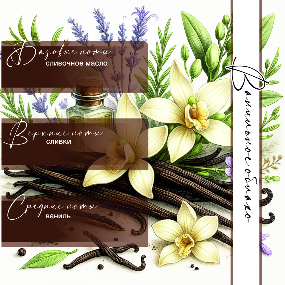 В мягкой базе раскрывается спокойная, тягучая сладость ванили, оставляя после себя нежный, почти невесомый след.